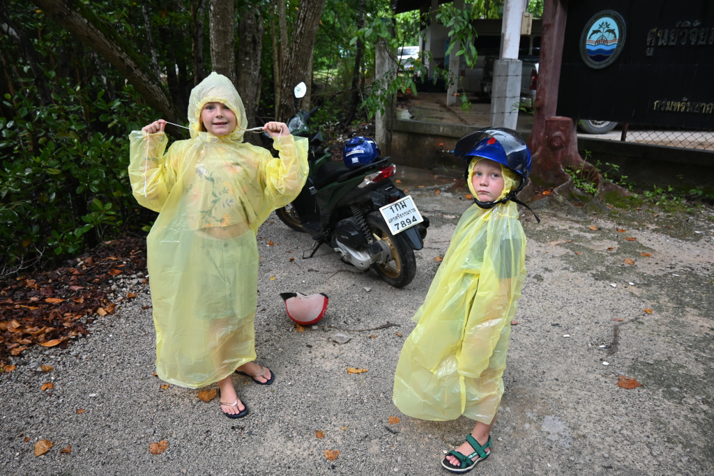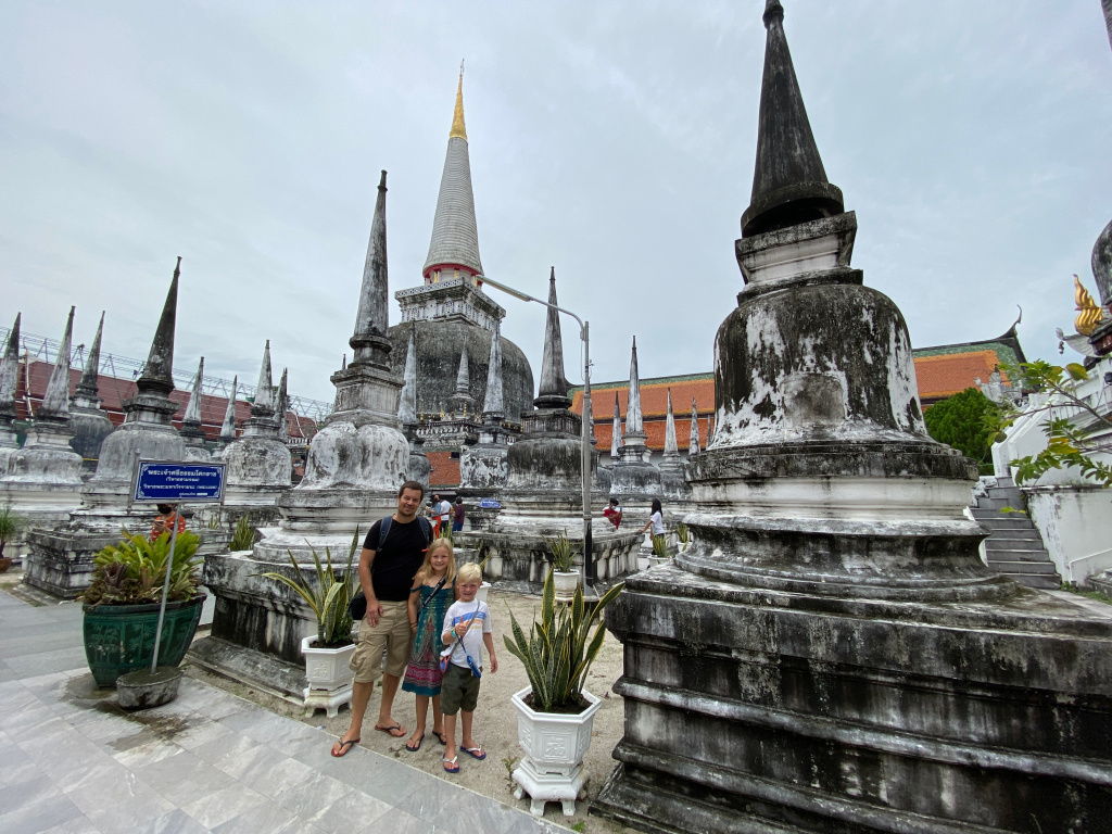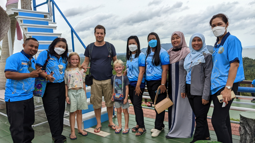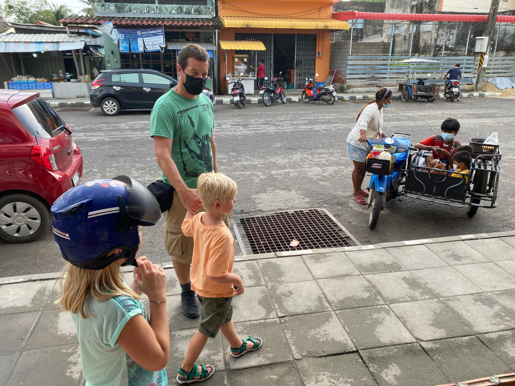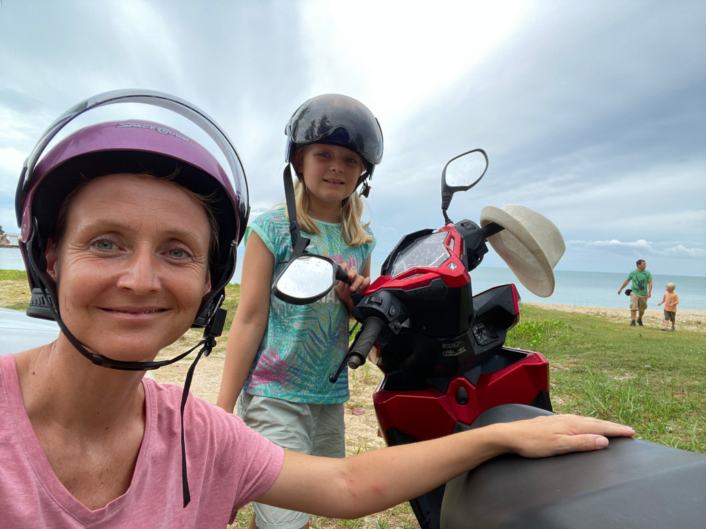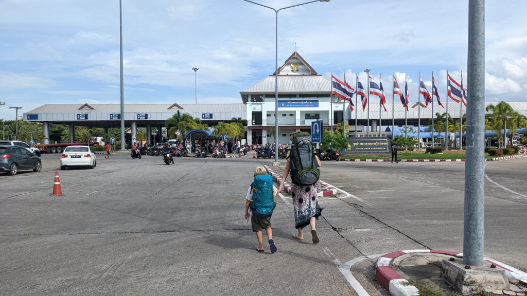 Nach Koh Samui haben wir ein kleines Paradies unweit der Fähre zu den Inseln entdeckt. Hier verbingen wir einige Tage am menschenleeren Strand von Ao Khanom und erkunden das Naturreservat um uns herum per Boot und Moped.Die Felsen bieten ungeahnte Möglichkeiten……es wird eifrig und ausdauernd geangelt.Waren wir 2018 noch zur viert auf einem Moped unterwegs, müssen nun zwei Mopeds ausgeliehen werden, um die Gegend zu erkunden. Zu Mamas Restaurant um die Ecke ging es auf die Schnelle aber auch nochmal mit einem.Den Weg zum Wasserfall schafft das Moped irgendwann nicht mehr und wir müssen laufen. Können dafür aber umso mehr den schönen Ausblick genießen.Es ist heiss und die Luft voller Moskitos. Leider reicht das Wasser nicht zum Baden.Auf dem Weg zurück laufen wir durch Kautschukplantagen.Schaukelpause an einem der vielen einsamen Strände an der Küste.Selbst hier im einsamen Naturreservat gibt es am Straßenrand stylische Cafés für eine Erfrischung. Leider wird wie so oft nur im Plastikbecher serviert.Ausblick aufs Meer.Tropical ParadiseReto bevorzugt die waghalsigere Variante.Findet 5 Kinder.Wir haben gelesen, dass es in Ao Khanom pinke Delfine gibt. Deswegen gehen wir auf eine Bootstour in den frühen Morgenstunden.Wir sehen viele Mangroven, Karstfelsen, noch mehr weisse Strände, viele kleine Fische (einer springt aus Vershen zu uns ins Boot),……aber leider keine pinken Delfine heute. Es war trotzdem eine wunderschöne Bootsfahrt.Wir erkunden die naheglegenen Mangroven.In der Stille hören wir unheimliche Laute bis wir auf einen Rudel Affen treffen und Reißaus nehmen.Auf der Flucht erwischt uns auch noch der Regen.Viewpoint hinter unserer Unterkunft.Blick ins Inland.Aber auch hier gibt es gerne mal Fotosessions.Delia und Reto haben von den Locals Mini-Hau gelernt (was immer das auch sein mag).Wir haben uns spontan entschlossen, weiter Richtung Süden nach Malaysia zu reisen. Deshalb machen wir einen Zwischenstop in Nakhon Si Thammarat.Die wirklich einzige Attraktion der Stadt ist ein riesiger Tempel.Ein Tempelwächter überwacht das rege Treiben.Dreimal Läuten bringt Glück.Ist der Tempel aussen sehr schlicht in weiss, strotzt er im Inneren nur so vor Farben.Reto interessiert sich vor allem für das Blattgold, welches von den Thais auf die Buddhas geklebt wird.Delia wird dafür wieder zum Fotomotiv.Die Stadt ist eine Flucht in die Mall wert.Alles blinkt und glitzert.Virtuelles Rennen durch Bangkok.Der Nachtmarkt ist wiederrum einen Besuch wert. Die Nudelsuppe und der Fried Rice mit crispy pork schmecken besonders köstlich.Nach einer langen Fahrt erreichen wir Sungai Kolok. Wir verlassen Thailand 1 Tag bevor unser Visum abläuft und gehen zu Fuß über die Freundschaftsbrücke (die über einen außerordentlich stinkenden Flussbereich führt) nach Malaysia.