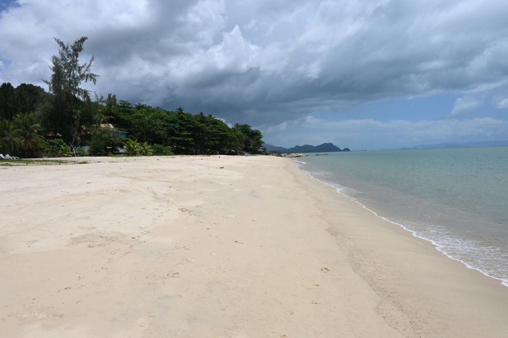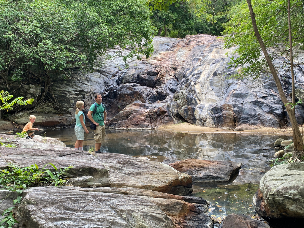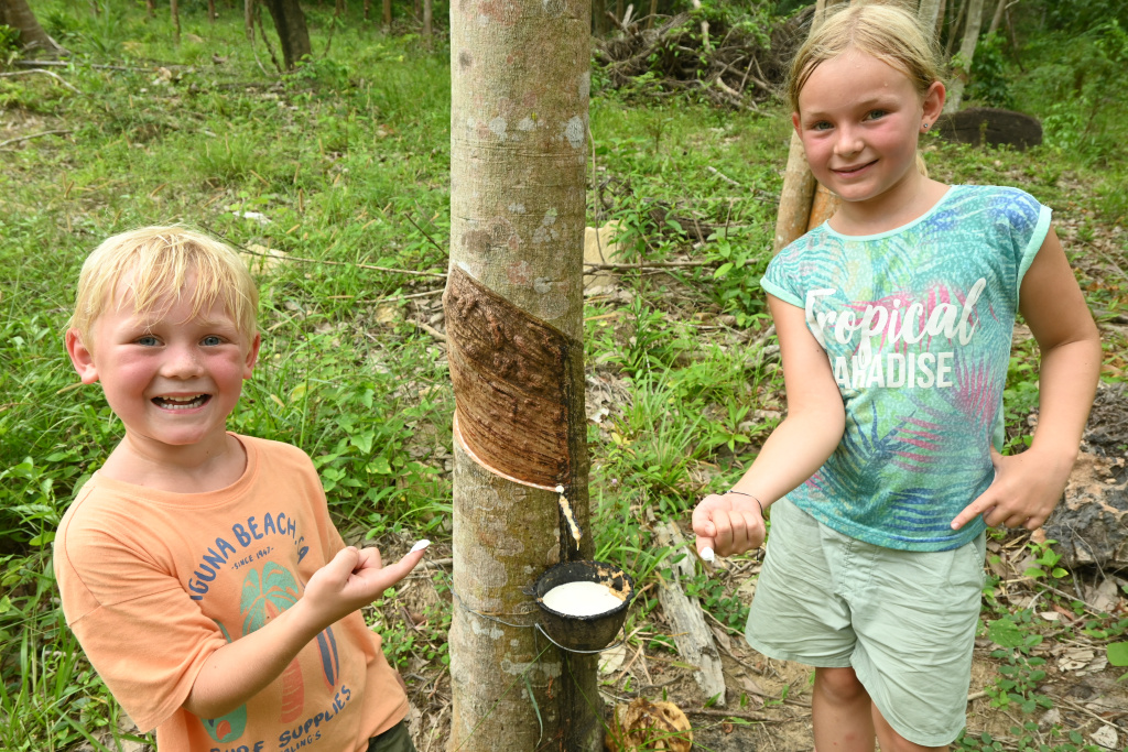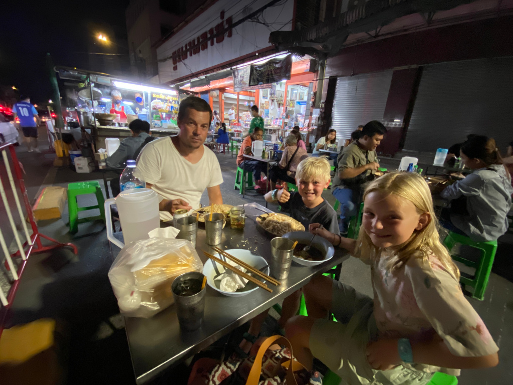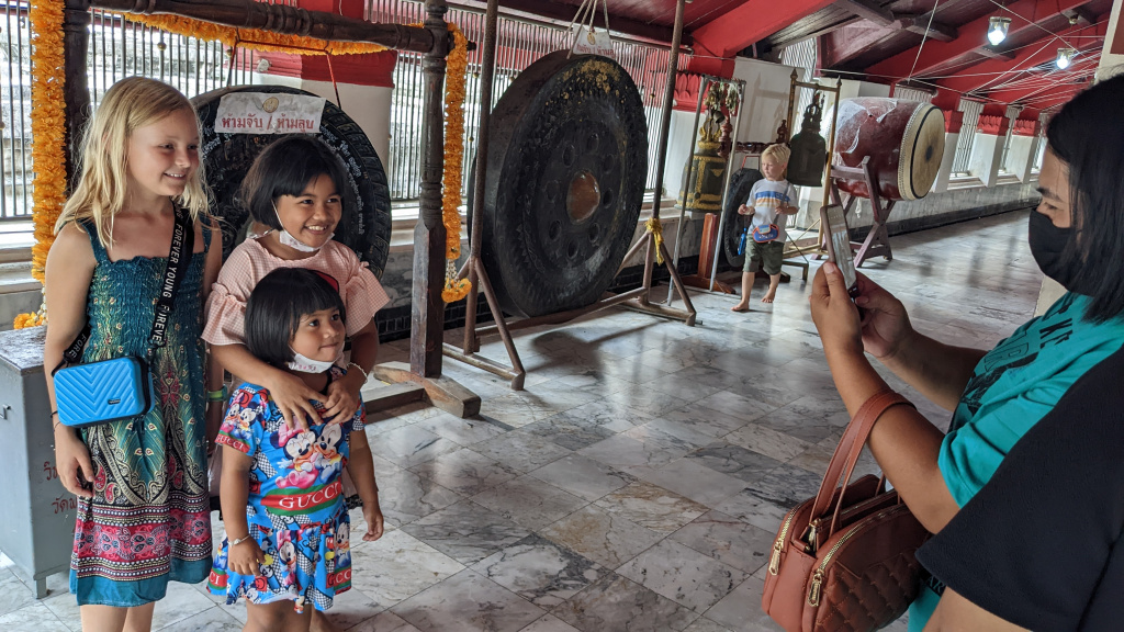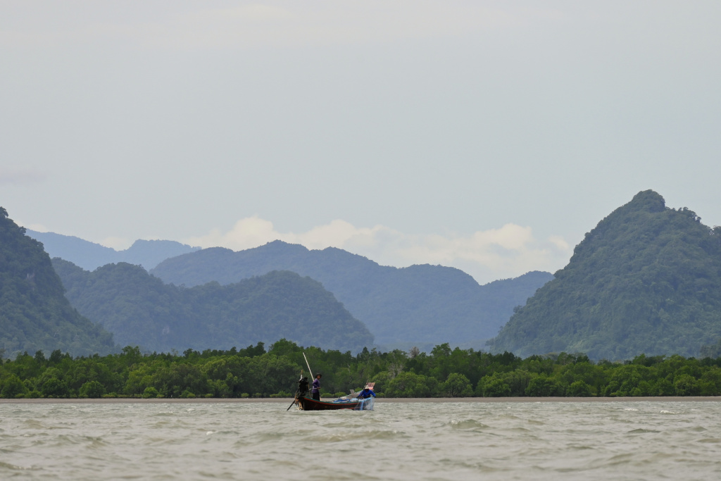 Nach Koh Samui haben wir ein kleines Paradies unweit der Fähre zu den Inseln entdeckt. Hier verbingen wir einige Tage am menschenleeren Strand von Ao Khanom und erkunden das Naturreservat um uns herum per Boot und Moped.Die Felsen bieten ungeahnte Möglichkeiten……es wird eifrig und ausdauernd geangelt.Waren wir 2018 noch zur viert auf einem Moped unterwegs, müssen nun zwei Mopeds ausgeliehen werden, um die Gegend zu erkunden. Zu Mamas Restaurant um die Ecke ging es auf die Schnelle aber auch nochmal mit einem.Den Weg zum Wasserfall schafft das Moped irgendwann nicht mehr und wir müssen laufen. Können dafür aber umso mehr den schönen Ausblick genießen.Es ist heiss und die Luft voller Moskitos. Leider reicht das Wasser nicht zum Baden.Auf dem Weg zurück laufen wir durch Kautschukplantagen.Schaukelpause an einem der vielen einsamen Strände an der Küste.Selbst hier im einsamen Naturreservat gibt es am Straßenrand stylische Cafés für eine Erfrischung. Leider wird wie so oft nur im Plastikbecher serviert.Ausblick aufs Meer.Tropical ParadiseReto bevorzugt die waghalsigere Variante.Findet 5 Kinder.Wir haben gelesen, dass es in Ao Khanom pinke Delfine gibt. Deswegen gehen wir auf eine Bootstour in den frühen Morgenstunden.Wir sehen viele Mangroven, Karstfelsen, noch mehr weisse Strände, viele kleine Fische (einer springt aus Vershen zu uns ins Boot),……aber leider keine pinken Delfine heute. Es war trotzdem eine wunderschöne Bootsfahrt.Wir erkunden die naheglegenen Mangroven.In der Stille hören wir unheimliche Laute bis wir auf einen Rudel Affen treffen und Reißaus nehmen.Auf der Flucht erwischt uns auch noch der Regen.Viewpoint hinter unserer Unterkunft.Blick ins Inland.Aber auch hier gibt es gerne mal Fotosessions.Delia und Reto haben von den Locals Mini-Hau gelernt (was immer das auch sein mag).Wir haben uns spontan entschlossen, weiter Richtung Süden nach Malaysia zu reisen. Deshalb machen wir einen Zwischenstop in Nakhon Si Thammarat.Die wirklich einzige Attraktion der Stadt ist ein riesiger Tempel.Ein Tempelwächter überwacht das rege Treiben.Dreimal Läuten bringt Glück.Ist der Tempel aussen sehr schlicht in weiss, strotzt er im Inneren nur so vor Farben.Reto interessiert sich vor allem für das Blattgold, welches von den Thais auf die Buddhas geklebt wird.Delia wird dafür wieder zum Fotomotiv.Die Stadt ist eine Flucht in die Mall wert.Alles blinkt und glitzert.Virtuelles Rennen durch Bangkok.Der Nachtmarkt ist wiederrum einen Besuch wert. Die Nudelsuppe und der Fried Rice mit crispy pork schmecken besonders köstlich.Nach einer langen Fahrt erreichen wir Sungai Kolok. Wir verlassen Thailand 1 Tag bevor unser Visum abläuft und gehen zu Fuß über die Freundschaftsbrücke (die über einen außerordentlich stinkenden Flussbereich führt) nach Malaysia.