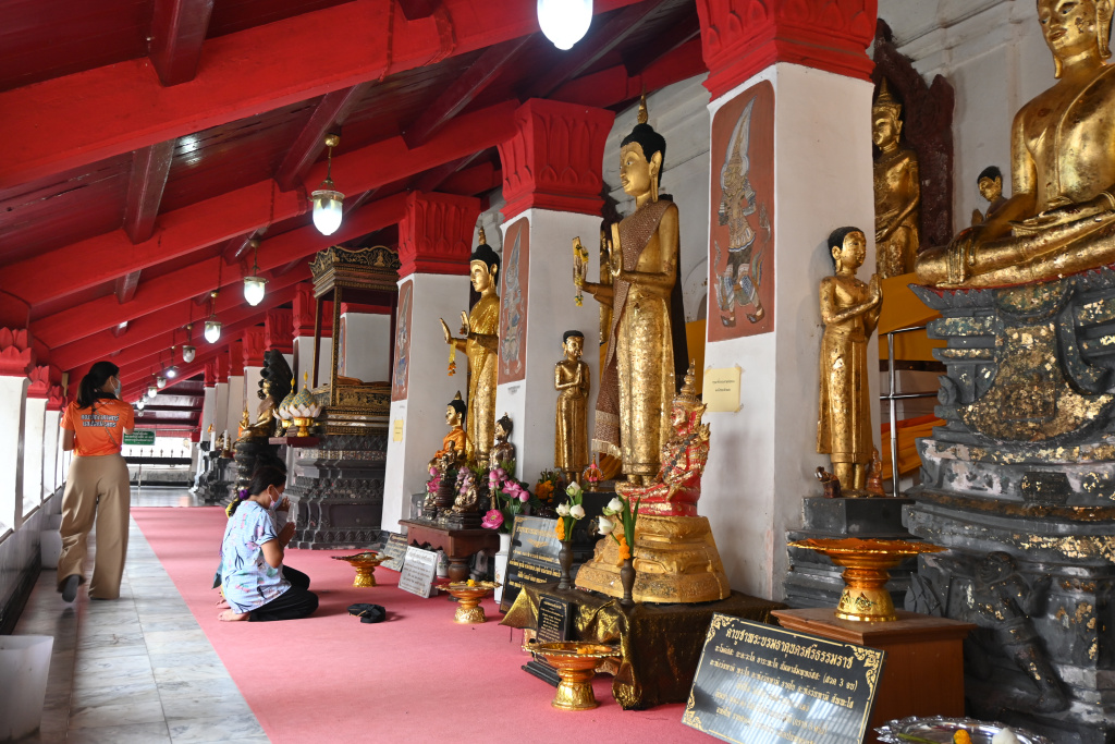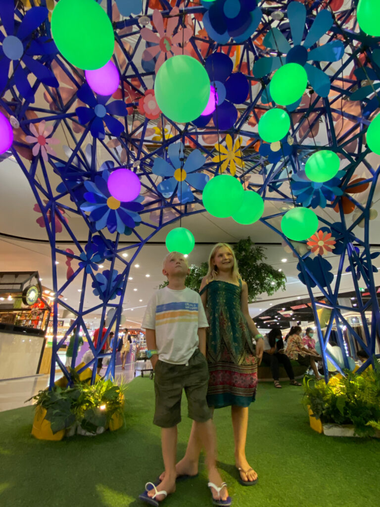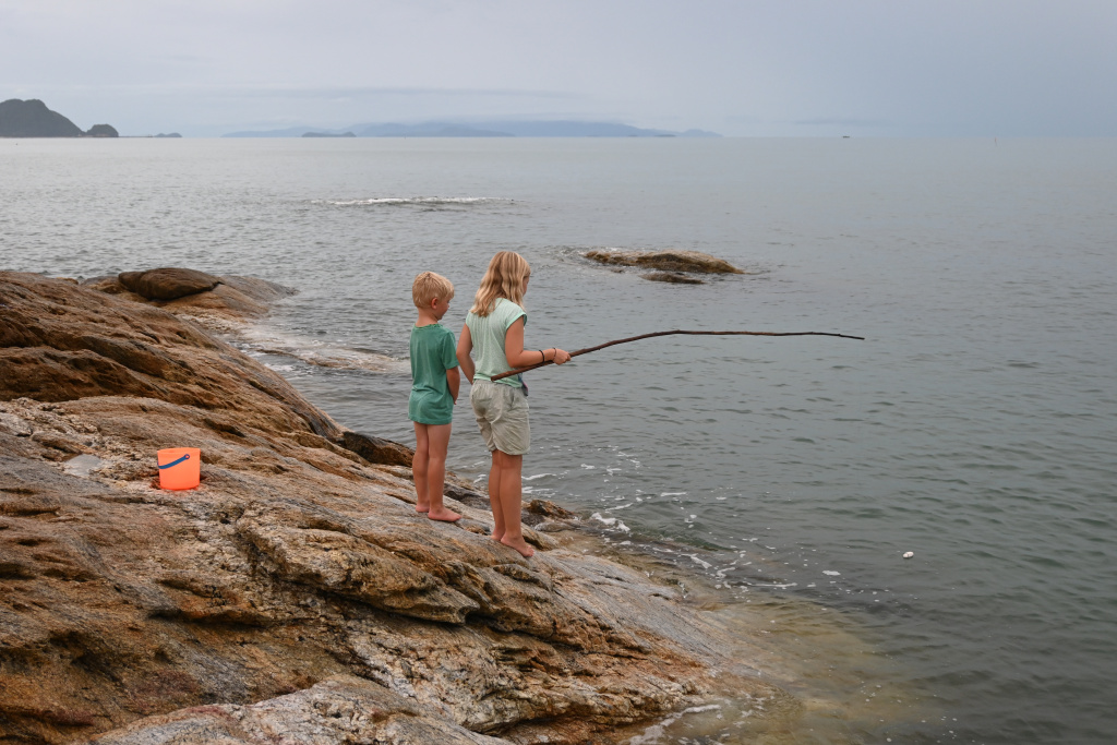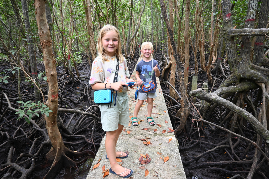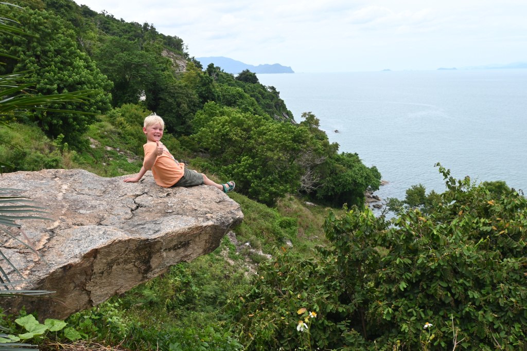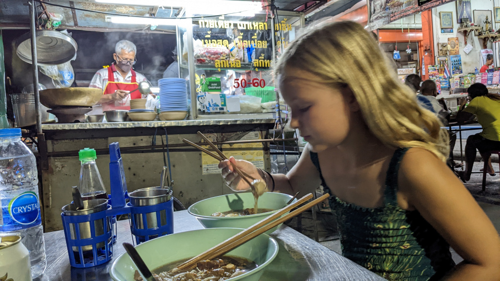 Nach Koh Samui haben wir ein kleines Paradies unweit der Fähre zu den Inseln entdeckt. Hier verbingen wir einige Tage am menschenleeren Strand von Ao Khanom und erkunden das Naturreservat um uns herum per Boot und Moped.Die Felsen bieten ungeahnte Möglichkeiten……es wird eifrig und ausdauernd geangelt.Waren wir 2018 noch zur viert auf einem Moped unterwegs, müssen nun zwei Mopeds ausgeliehen werden, um die Gegend zu erkunden. Zu Mamas Restaurant um die Ecke ging es auf die Schnelle aber auch nochmal mit einem.Den Weg zum Wasserfall schafft das Moped irgendwann nicht mehr und wir müssen laufen. Können dafür aber umso mehr den schönen Ausblick genießen.Es ist heiss und die Luft voller Moskitos. Leider reicht das Wasser nicht zum Baden.Auf dem Weg zurück laufen wir durch Kautschukplantagen.Schaukelpause an einem der vielen einsamen Strände an der Küste.Selbst hier im einsamen Naturreservat gibt es am Straßenrand stylische Cafés für eine Erfrischung. Leider wird wie so oft nur im Plastikbecher serviert.Ausblick aufs Meer.Tropical ParadiseReto bevorzugt die waghalsigere Variante.Findet 5 Kinder.Wir haben gelesen, dass es in Ao Khanom pinke Delfine gibt. Deswegen gehen wir auf eine Bootstour in den frühen Morgenstunden.Wir sehen viele Mangroven, Karstfelsen, noch mehr weisse Strände, viele kleine Fische (einer springt aus Vershen zu uns ins Boot),……aber leider keine pinken Delfine heute. Es war trotzdem eine wunderschöne Bootsfahrt.Wir erkunden die naheglegenen Mangroven.In der Stille hören wir unheimliche Laute bis wir auf einen Rudel Affen treffen und Reißaus nehmen.Auf der Flucht erwischt uns auch noch der Regen.Viewpoint hinter unserer Unterkunft.Blick ins Inland.Aber auch hier gibt es gerne mal Fotosessions.Delia und Reto haben von den Locals Mini-Hau gelernt (was immer das auch sein mag).Wir haben uns spontan entschlossen, weiter Richtung Süden nach Malaysia zu reisen. Deshalb machen wir einen Zwischenstop in Nakhon Si Thammarat.Die wirklich einzige Attraktion der Stadt ist ein riesiger Tempel.Ein Tempelwächter überwacht das rege Treiben.Dreimal Läuten bringt Glück.Ist der Tempel aussen sehr schlicht in weiss, strotzt er im Inneren nur so vor Farben.Reto interessiert sich vor allem für das Blattgold, welches von den Thais auf die Buddhas geklebt wird.Delia wird dafür wieder zum Fotomotiv.Die Stadt ist eine Flucht in die Mall wert.Alles blinkt und glitzert.Virtuelles Rennen durch Bangkok.Der Nachtmarkt ist wiederrum einen Besuch wert. Die Nudelsuppe und der Fried Rice mit crispy pork schmecken besonders köstlich.Nach einer langen Fahrt erreichen wir Sungai Kolok. Wir verlassen Thailand 1 Tag bevor unser Visum abläuft und gehen zu Fuß über die Freundschaftsbrücke (die über einen außerordentlich stinkenden Flussbereich führt) nach Malaysia.