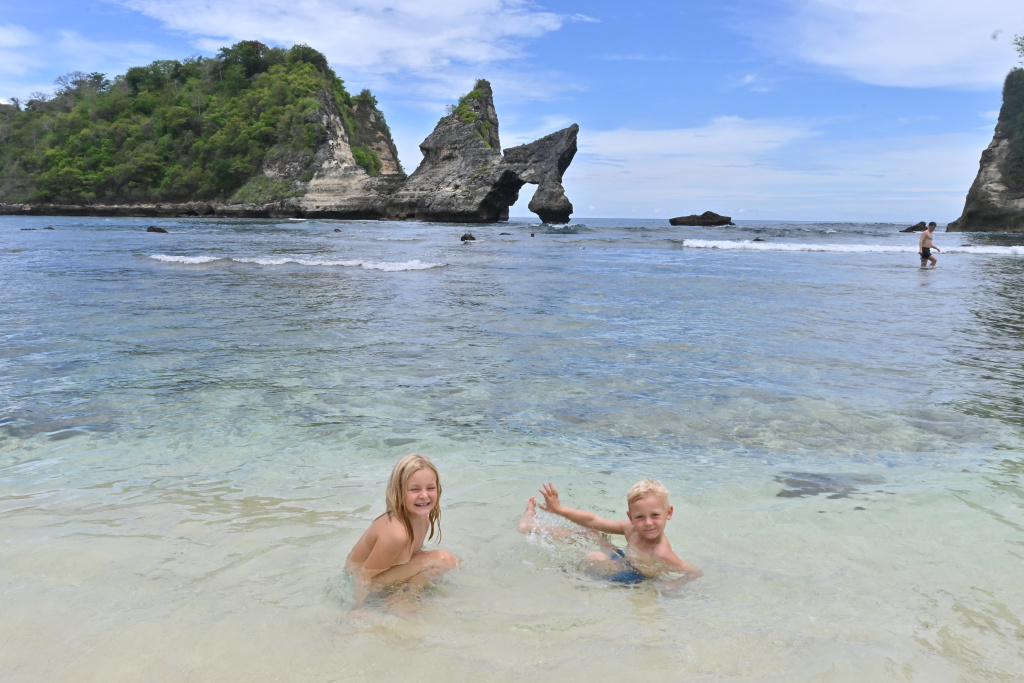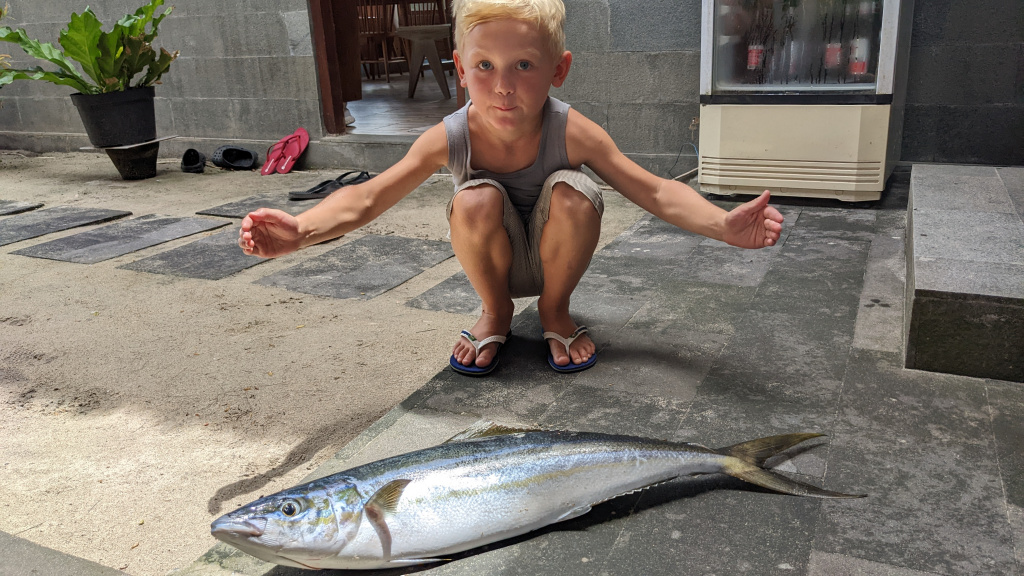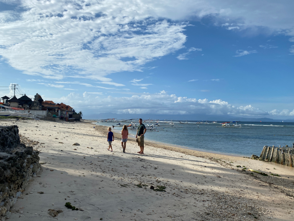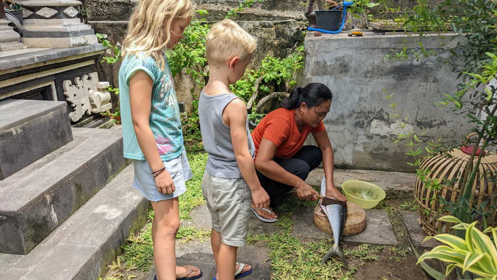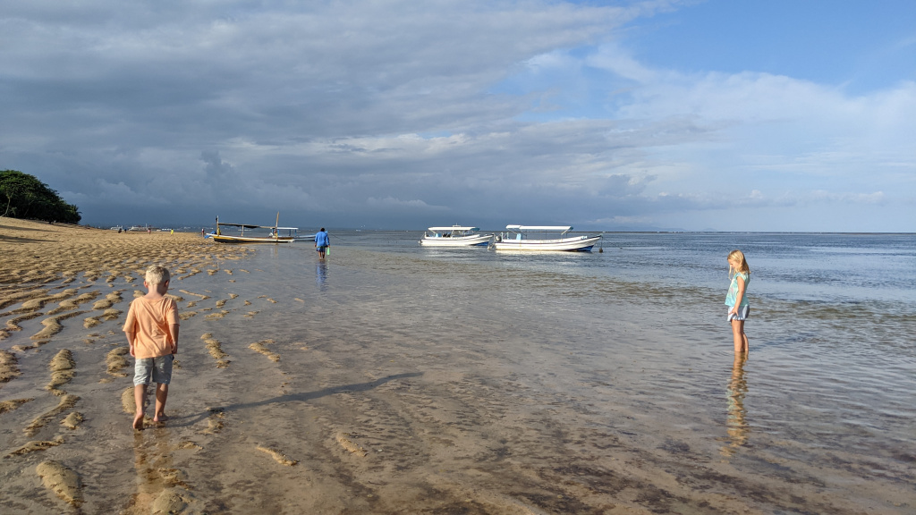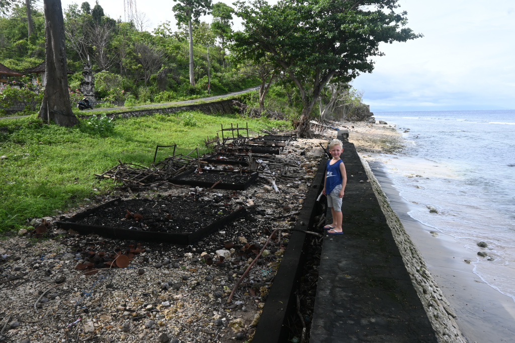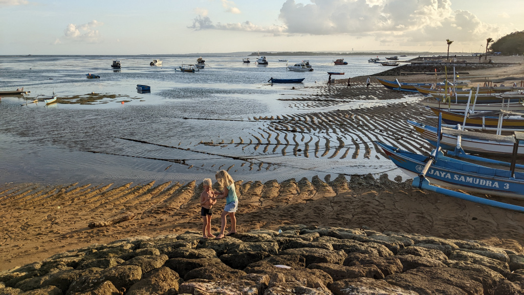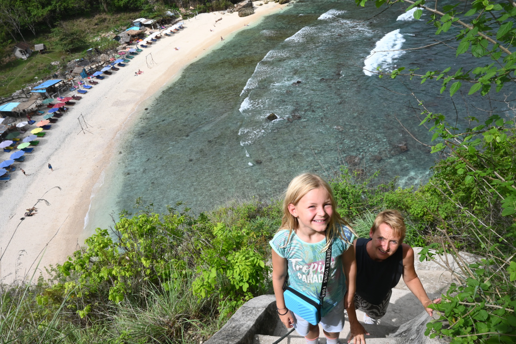 Wir fahren von Ubud nach Sanur im Großraum Denpasar. Hier stoßen wir den Prozess an unsere Visa zu verlängern und machen ein wenig Reiseplanung. Der Strand eignet sich nicht unbedingt gut zum Schwimmen, dafür aber umso besser zum Rumstromern.Dabei findet sich so allerlei Interessantes.Hier werden gerade Muscheln gesammelt. Auf unserem Balkon können dann auch Delia und Reto feststellen, dass sie in der Sonne fürchterlich anfangen zu stinken. Die Eltern scheinen also doch nicht zu lügen;-)Wir entscheiden uns ein paar Tage auf Nusa Penida zu verbringen, die größte Insel vor Bali. Als wir 2010 auf der nahegelegenen Nusa Lembongan waren, gab es auf Nusa Penida noch gar keine Unterkünfte.Vorher wollen wir aber noch die kulinarischen Möglichkeiten von Sanur austesten… und immer schön auf die Opfergaben achten!Pho Bo beim Vietnamesen mit Dragonfruit-Shake.Das Kartenspiel von Delia’s Freundinnen und Freunden kommt mittlerweile regelmäßig zum MauMau-Einsatz.Sushi lieben alle!!Das Visaverfahren läuft und wir machen uns mit unseren Bootstickets auf zum Hafen. Ehe wir uns versehen, werden unsere Rucksäcke aufs Schiff getragen.Und unsere Kinder ebenso:-) Die Indonesier sind übrigens alle irre freundlich!Auf Nusa Penida beziehen wir eine Unterkunft mit kleinem Pool direkt am Meer. Hier lässt sich prima chillen. Dabei sehen wir den Fischern mit ihren Auslegerbooten zu.Der Innenhof ist vollgestopft mit Tempelchen und Bonsais. Das Hobby unseres Gastgebers Wayan.Über das Meer blicken wir auf Bali. Der große Vulkan hüllt sich meist in Wolken.Nebenan im „Chill“. Prima Aussicht über die Algenfarmen und leckeres Essen.Die Kids haben mal wieder zwei Deutsche erwischt und erzählen ihnen ihre Geschichte.Am nächsten Morgen haben wir Glück und sehen den Gunung Batur.Währenddessen machen sich die Fischer auf den Weg.Unter uns werden Algen an im Wasser gespannten Seilen ausgesetzt. In sechs Wochen wird ausgewachsenes Seegras für Kosmetika etc. geerntet und der Turnus beginnt erneut.Nadja freundet sich mit der Dorfjugend an.Die Kids können wahrscheinlich schwimmen ehe sie laufen lernen.Wir entdecken, dass das Meer gleich vor unserer Nase voller Korallen und bunter Fische ist!Beim Schnorcheln.Auf Nusa Penida ist sehr viel weniger Verkehr als auf Bali, sodass wir wieder auf Mopeds steigen und die Insel erkunden.Durch Zufall entdecken wir den Ort, an dem die Toten verbrannt werden.Tempel gibt es natürlich auch in Hülle und Fülle.Sowie reich geschmückte Wächter.Wir finden einen tollen Platz zum Sundownern.Abends gibt es Babi Guling, das indonesische Spanferkel. Nicht leicht zu finden im größten muslimischen Land derr Erde. Sieht anders aus und schmeckt anders. Vor allem ist es hölllisch scharf. Viel zu scharf für die Kids.Dafür gibt es auf dem Rückweg Eis beim Sonnenuntergang.Wir teilen unsere Unterkunft mit einer Schweizer Familie, die auch ein Jahr unterwegs ist. Die Kinder freuen sich endlich mal wieder unter ihresgleichen zu sein.Am Regentag darf auch gemeinsam Film geschaut werden:-)Wir Fahren zum unglaublichen Diamond Beach.Die in die Felswand gehauene Treppe ist so steil, dass wir es vorziehen stattdessen zum Atuh Beach hinabzusteigen.Aber zuerst schauen wir uns alles in Ruhe von oben an.Auch dieser Abstieg ist ganz schön abenteuerlich!Aber er lohnt sich!Der beschwerlich Aufstieg am Ende.Zurück in der Unterkunft belagern Delia und Reto einen Fischer, der ihnen etwas von seinem Fang abtritt. Die Fische werden umgehend gebraten und verspeist.Den größten Fisch bekommen wir für 10€ (3kg) zum Kauf angeboten. Wir schlagen ein. Unsere Gastfamilie kocht und wir essen gemeinsam.Aber zunächst wir natürlich geschuppt und ausgenommen.Es gibt frittierte Fischhappen und köstliche Fischsuppen mit jeder Menge Gräten;-) Wir lieben es!Am nächsten Morgen geht es früh los. Unsere Gastgeberin ist schon mit den Opfergaben unterwegs. 200 brauchen sie jede Woche! Blumen, Feuer und Wasser vereinen sich in den Blättterschälchen.Nach eine guten Stunde Mopedfahrt ist die Südküste erreicht.Hier liegt der berüchtigte Kelingking Beach. Die Klippe gleicht von oben einem T-Rex:-)Der Weg über den schmalen Grat nach unten geht in eine fast senkrechte Kletterpartie über (siehe hinten im Bild).Früh am Morgen ist man noch fast allein hier. Gegen Mittag rollen die Tagestouren von Bali an und der Klettersteig wird gefährlich voll.Die Affenfamilie beobachtet das Treiben gelassen von oben. Wir fahren morgen zurück nach Sanur und wollen von dort weiter in ein Surfcamp, welches unsere Schweizer Freunde uns empfohlen haben.