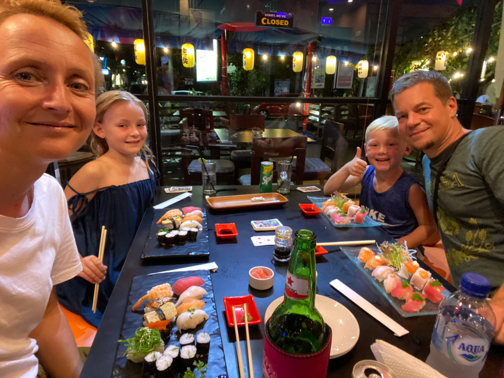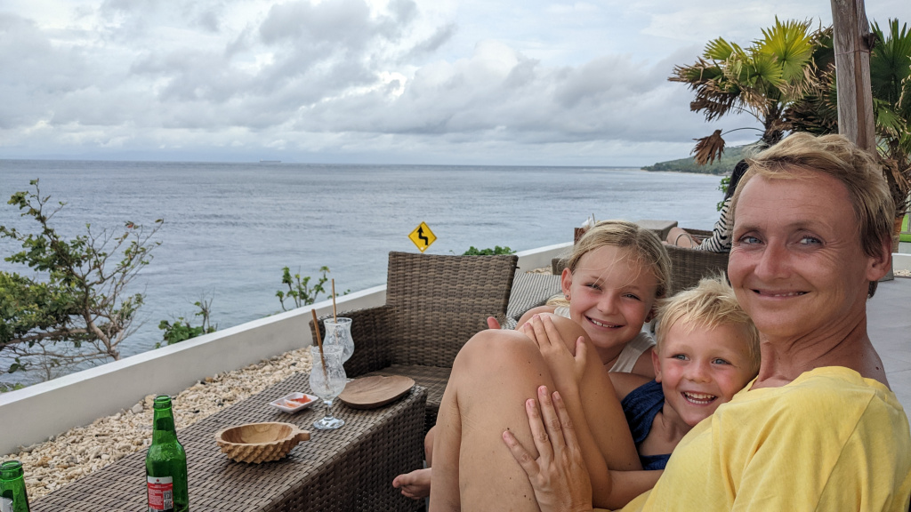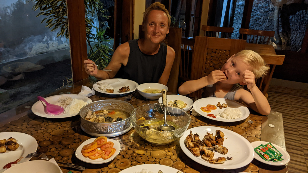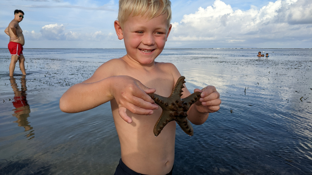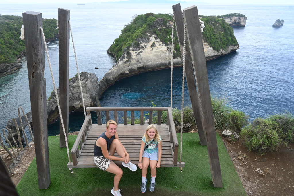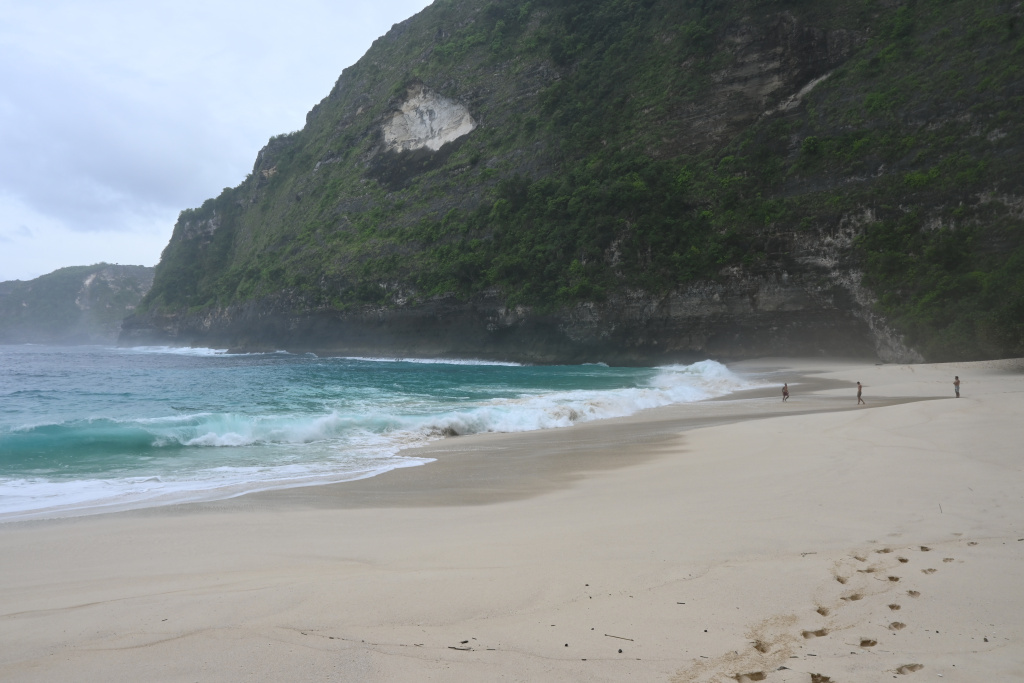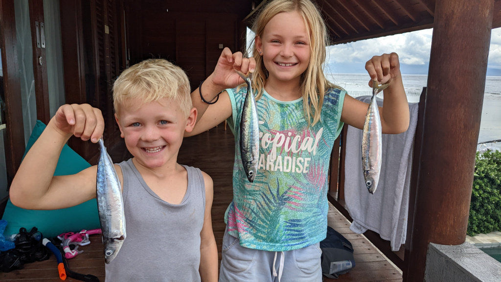 Wir fahren von Ubud nach Sanur im Großraum Denpasar. Hier stoßen wir den Prozess an unsere Visa zu verlängern und machen ein wenig Reiseplanung. Der Strand eignet sich nicht unbedingt gut zum Schwimmen, dafür aber umso besser zum Rumstromern.Dabei findet sich so allerlei Interessantes.Hier werden gerade Muscheln gesammelt. Auf unserem Balkon können dann auch Delia und Reto feststellen, dass sie in der Sonne fürchterlich anfangen zu stinken. Die Eltern scheinen also doch nicht zu lügen;-)Wir entscheiden uns ein paar Tage auf Nusa Penida zu verbringen, die größte Insel vor Bali. Als wir 2010 auf der nahegelegenen Nusa Lembongan waren, gab es auf Nusa Penida noch gar keine Unterkünfte.Vorher wollen wir aber noch die kulinarischen Möglichkeiten von Sanur austesten… und immer schön auf die Opfergaben achten!Pho Bo beim Vietnamesen mit Dragonfruit-Shake.Das Kartenspiel von Delia’s Freundinnen und Freunden kommt mittlerweile regelmäßig zum MauMau-Einsatz.Sushi lieben alle!!Das Visaverfahren läuft und wir machen uns mit unseren Bootstickets auf zum Hafen. Ehe wir uns versehen, werden unsere Rucksäcke aufs Schiff getragen.Und unsere Kinder ebenso:-) Die Indonesier sind übrigens alle irre freundlich!Auf Nusa Penida beziehen wir eine Unterkunft mit kleinem Pool direkt am Meer. Hier lässt sich prima chillen. Dabei sehen wir den Fischern mit ihren Auslegerbooten zu.Der Innenhof ist vollgestopft mit Tempelchen und Bonsais. Das Hobby unseres Gastgebers Wayan.Über das Meer blicken wir auf Bali. Der große Vulkan hüllt sich meist in Wolken.Nebenan im „Chill“. Prima Aussicht über die Algenfarmen und leckeres Essen.Die Kids haben mal wieder zwei Deutsche erwischt und erzählen ihnen ihre Geschichte.Am nächsten Morgen haben wir Glück und sehen den Gunung Batur.Währenddessen machen sich die Fischer auf den Weg.Unter uns werden Algen an im Wasser gespannten Seilen ausgesetzt. In sechs Wochen wird ausgewachsenes Seegras für Kosmetika etc. geerntet und der Turnus beginnt erneut.Nadja freundet sich mit der Dorfjugend an.Die Kids können wahrscheinlich schwimmen ehe sie laufen lernen.Wir entdecken, dass das Meer gleich vor unserer Nase voller Korallen und bunter Fische ist!Beim Schnorcheln.Auf Nusa Penida ist sehr viel weniger Verkehr als auf Bali, sodass wir wieder auf Mopeds steigen und die Insel erkunden.Durch Zufall entdecken wir den Ort, an dem die Toten verbrannt werden.Tempel gibt es natürlich auch in Hülle und Fülle.Sowie reich geschmückte Wächter.Wir finden einen tollen Platz zum Sundownern.Abends gibt es Babi Guling, das indonesische Spanferkel. Nicht leicht zu finden im größten muslimischen Land derr Erde. Sieht anders aus und schmeckt anders. Vor allem ist es hölllisch scharf. Viel zu scharf für die Kids.Dafür gibt es auf dem Rückweg Eis beim Sonnenuntergang.Wir teilen unsere Unterkunft mit einer Schweizer Familie, die auch ein Jahr unterwegs ist. Die Kinder freuen sich endlich mal wieder unter ihresgleichen zu sein.Am Regentag darf auch gemeinsam Film geschaut werden:-)Wir Fahren zum unglaublichen Diamond Beach.Die in die Felswand gehauene Treppe ist so steil, dass wir es vorziehen stattdessen zum Atuh Beach hinabzusteigen.Aber zuerst schauen wir uns alles in Ruhe von oben an.Auch dieser Abstieg ist ganz schön abenteuerlich!Aber er lohnt sich!Der beschwerlich Aufstieg am Ende.Zurück in der Unterkunft belagern Delia und Reto einen Fischer, der ihnen etwas von seinem Fang abtritt. Die Fische werden umgehend gebraten und verspeist.Den größten Fisch bekommen wir für 10€ (3kg) zum Kauf angeboten. Wir schlagen ein. Unsere Gastfamilie kocht und wir essen gemeinsam.Aber zunächst wir natürlich geschuppt und ausgenommen.Es gibt frittierte Fischhappen und köstliche Fischsuppen mit jeder Menge Gräten;-) Wir lieben es!Am nächsten Morgen geht es früh los. Unsere Gastgeberin ist schon mit den Opfergaben unterwegs. 200 brauchen sie jede Woche! Blumen, Feuer und Wasser vereinen sich in den Blättterschälchen.Nach eine guten Stunde Mopedfahrt ist die Südküste erreicht.Hier liegt der berüchtigte Kelingking Beach. Die Klippe gleicht von oben einem T-Rex:-)Der Weg über den schmalen Grat nach unten geht in eine fast senkrechte Kletterpartie über (siehe hinten im Bild).Früh am Morgen ist man noch fast allein hier. Gegen Mittag rollen die Tagestouren von Bali an und der Klettersteig wird gefährlich voll.Die Affenfamilie beobachtet das Treiben gelassen von oben. Wir fahren morgen zurück nach Sanur und wollen von dort weiter in ein Surfcamp, welches unsere Schweizer Freunde uns empfohlen haben.