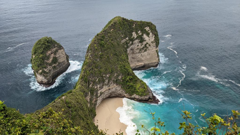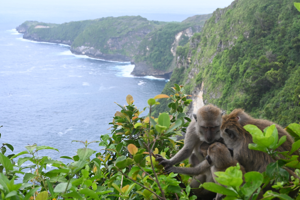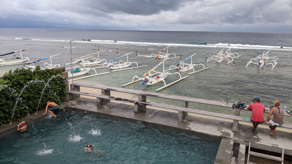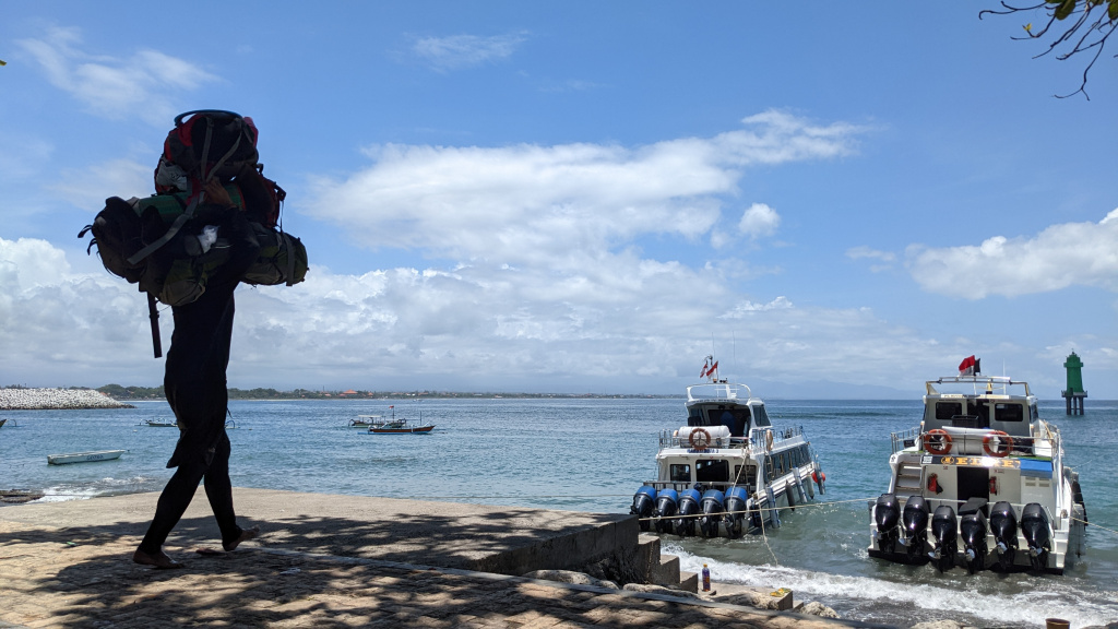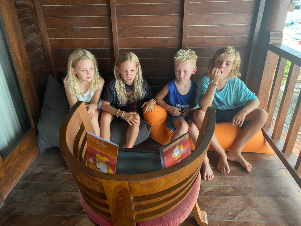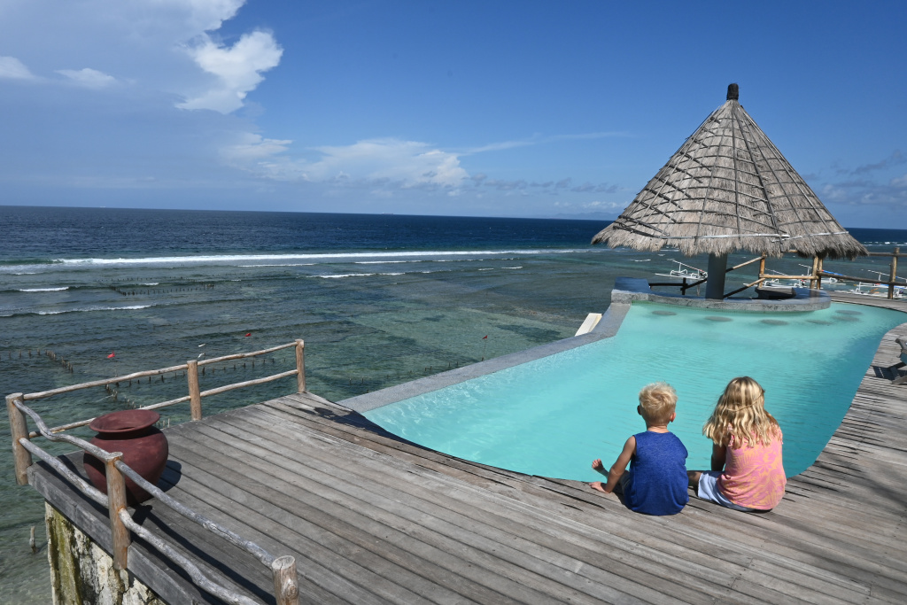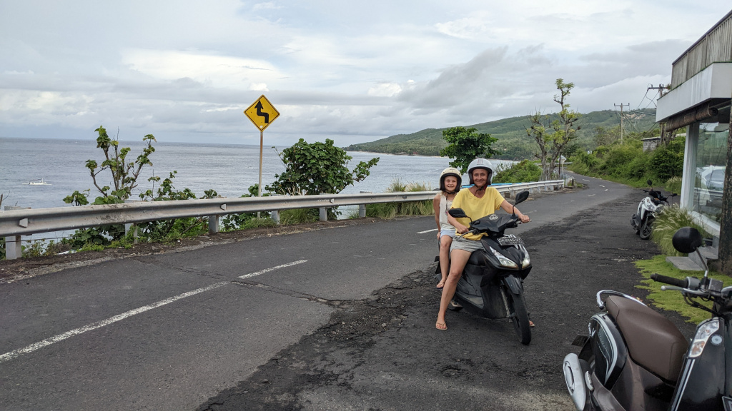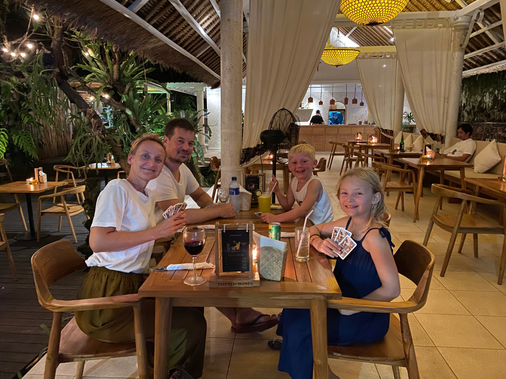 Wir fahren von Ubud nach Sanur im Großraum Denpasar. Hier stoßen wir den Prozess an unsere Visa zu verlängern und machen ein wenig Reiseplanung. Der Strand eignet sich nicht unbedingt gut zum Schwimmen, dafür aber umso besser zum Rumstromern.Dabei findet sich so allerlei Interessantes.Hier werden gerade Muscheln gesammelt. Auf unserem Balkon können dann auch Delia und Reto feststellen, dass sie in der Sonne fürchterlich anfangen zu stinken. Die Eltern scheinen also doch nicht zu lügen;-)Wir entscheiden uns ein paar Tage auf Nusa Penida zu verbringen, die größte Insel vor Bali. Als wir 2010 auf der nahegelegenen Nusa Lembongan waren, gab es auf Nusa Penida noch gar keine Unterkünfte.Vorher wollen wir aber noch die kulinarischen Möglichkeiten von Sanur austesten… und immer schön auf die Opfergaben achten!Pho Bo beim Vietnamesen mit Dragonfruit-Shake.Das Kartenspiel von Delia’s Freundinnen und Freunden kommt mittlerweile regelmäßig zum MauMau-Einsatz.Sushi lieben alle!!Das Visaverfahren läuft und wir machen uns mit unseren Bootstickets auf zum Hafen. Ehe wir uns versehen, werden unsere Rucksäcke aufs Schiff getragen.Und unsere Kinder ebenso:-) Die Indonesier sind übrigens alle irre freundlich!Auf Nusa Penida beziehen wir eine Unterkunft mit kleinem Pool direkt am Meer. Hier lässt sich prima chillen. Dabei sehen wir den Fischern mit ihren Auslegerbooten zu.Der Innenhof ist vollgestopft mit Tempelchen und Bonsais. Das Hobby unseres Gastgebers Wayan.Über das Meer blicken wir auf Bali. Der große Vulkan hüllt sich meist in Wolken.Nebenan im „Chill“. Prima Aussicht über die Algenfarmen und leckeres Essen.Die Kids haben mal wieder zwei Deutsche erwischt und erzählen ihnen ihre Geschichte.Am nächsten Morgen haben wir Glück und sehen den Gunung Batur.Währenddessen machen sich die Fischer auf den Weg.Unter uns werden Algen an im Wasser gespannten Seilen ausgesetzt. In sechs Wochen wird ausgewachsenes Seegras für Kosmetika etc. geerntet und der Turnus beginnt erneut.Nadja freundet sich mit der Dorfjugend an.Die Kids können wahrscheinlich schwimmen ehe sie laufen lernen.Wir entdecken, dass das Meer gleich vor unserer Nase voller Korallen und bunter Fische ist!Beim Schnorcheln.Auf Nusa Penida ist sehr viel weniger Verkehr als auf Bali, sodass wir wieder auf Mopeds steigen und die Insel erkunden.Durch Zufall entdecken wir den Ort, an dem die Toten verbrannt werden.Tempel gibt es natürlich auch in Hülle und Fülle.Sowie reich geschmückte Wächter.Wir finden einen tollen Platz zum Sundownern.Abends gibt es Babi Guling, das indonesische Spanferkel. Nicht leicht zu finden im größten muslimischen Land derr Erde. Sieht anders aus und schmeckt anders. Vor allem ist es hölllisch scharf. Viel zu scharf für die Kids.Dafür gibt es auf dem Rückweg Eis beim Sonnenuntergang.Wir teilen unsere Unterkunft mit einer Schweizer Familie, die auch ein Jahr unterwegs ist. Die Kinder freuen sich endlich mal wieder unter ihresgleichen zu sein.Am Regentag darf auch gemeinsam Film geschaut werden:-)Wir Fahren zum unglaublichen Diamond Beach.Die in die Felswand gehauene Treppe ist so steil, dass wir es vorziehen stattdessen zum Atuh Beach hinabzusteigen.Aber zuerst schauen wir uns alles in Ruhe von oben an.Auch dieser Abstieg ist ganz schön abenteuerlich!Aber er lohnt sich!Der beschwerlich Aufstieg am Ende.Zurück in der Unterkunft belagern Delia und Reto einen Fischer, der ihnen etwas von seinem Fang abtritt. Die Fische werden umgehend gebraten und verspeist.Den größten Fisch bekommen wir für 10€ (3kg) zum Kauf angeboten. Wir schlagen ein. Unsere Gastfamilie kocht und wir essen gemeinsam.Aber zunächst wir natürlich geschuppt und ausgenommen.Es gibt frittierte Fischhappen und köstliche Fischsuppen mit jeder Menge Gräten;-) Wir lieben es!Am nächsten Morgen geht es früh los. Unsere Gastgeberin ist schon mit den Opfergaben unterwegs. 200 brauchen sie jede Woche! Blumen, Feuer und Wasser vereinen sich in den Blättterschälchen.Nach eine guten Stunde Mopedfahrt ist die Südküste erreicht.Hier liegt der berüchtigte Kelingking Beach. Die Klippe gleicht von oben einem T-Rex:-)Der Weg über den schmalen Grat nach unten geht in eine fast senkrechte Kletterpartie über (siehe hinten im Bild).Früh am Morgen ist man noch fast allein hier. Gegen Mittag rollen die Tagestouren von Bali an und der Klettersteig wird gefährlich voll.Die Affenfamilie beobachtet das Treiben gelassen von oben. Wir fahren morgen zurück nach Sanur und wollen von dort weiter in ein Surfcamp, welches unsere Schweizer Freunde uns empfohlen haben.
