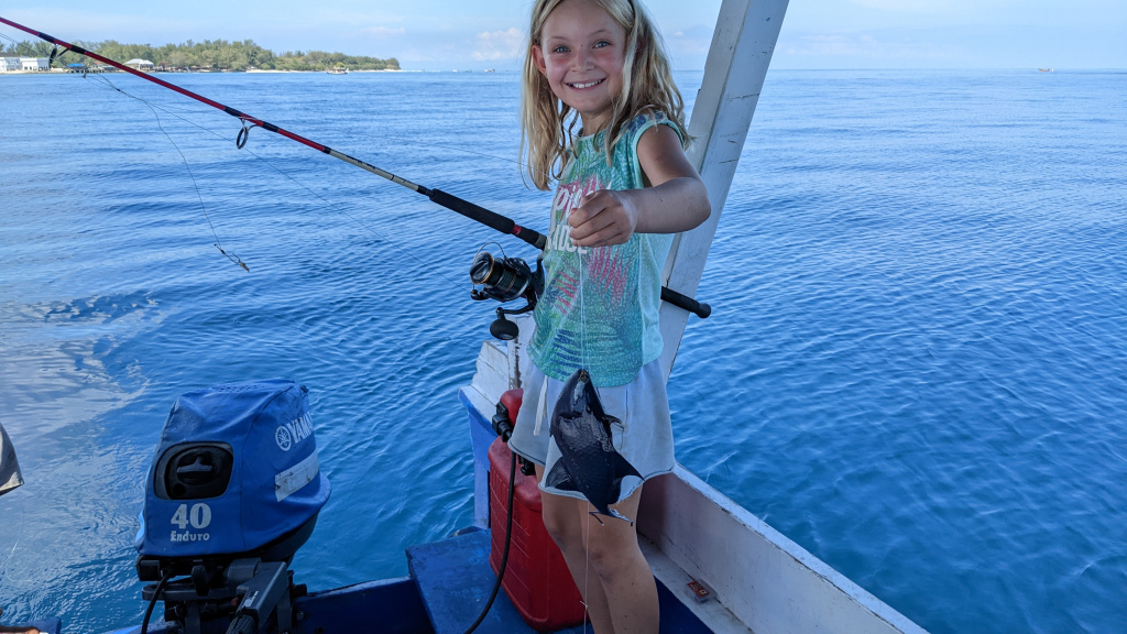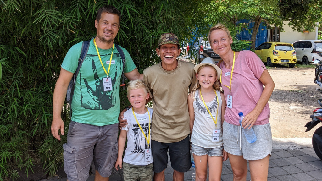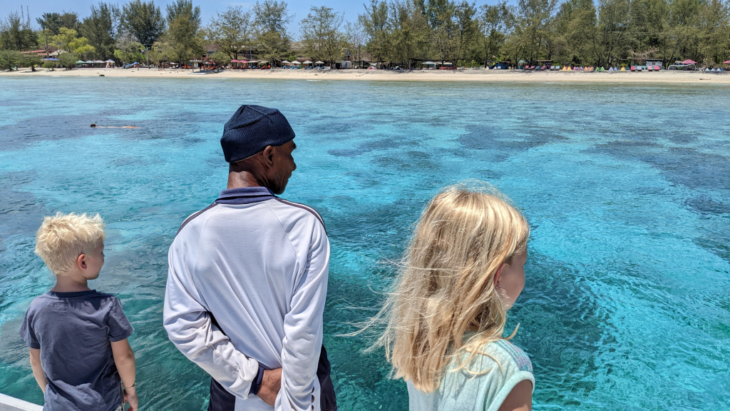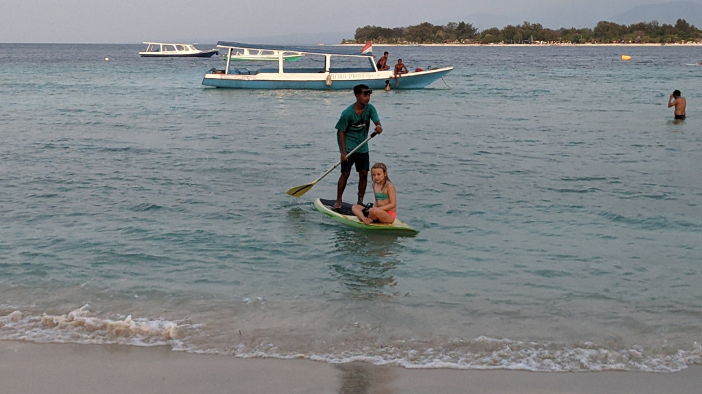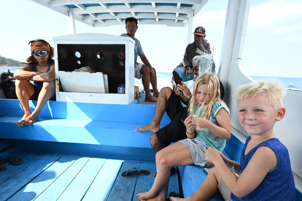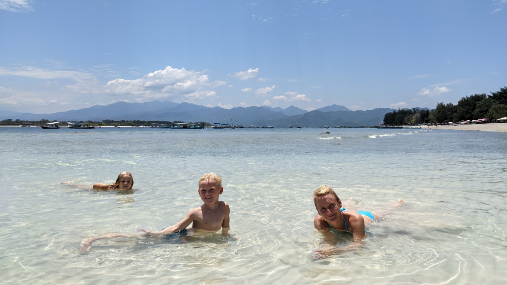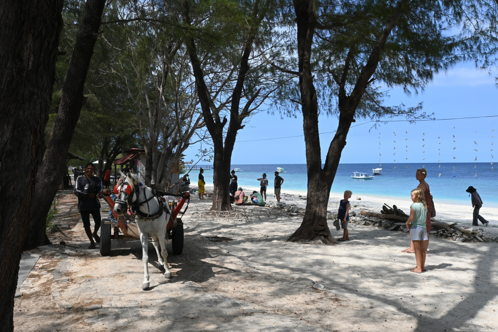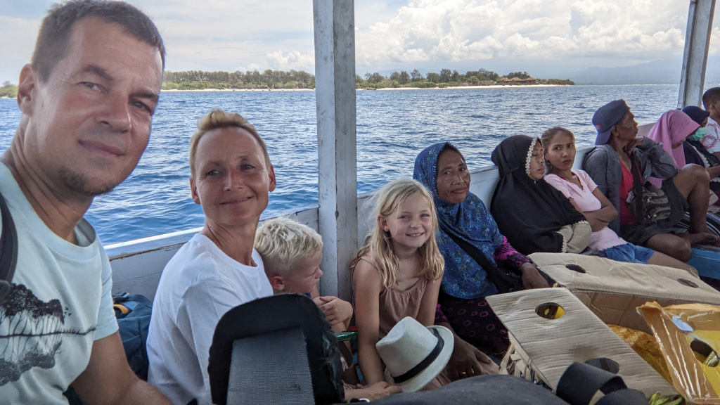 Nunung vom Surfcamp fährt uns früh morgens nach Padang Bai. Von dort startet das Boot zu den Gilis. Auch wenn wir nur eine gute Woche in der Surf WG waren, fällt uns der Abschied schwer.Die Überfahrt ist ziemlich wellig und nach einem kurzen Halt auf Lombok sind wir froh, endlich wieder unsere Füsse auf Sand zu setzen. Willkommen auf Gili Trawangan, von den Locals kurz Gili-T genannt. Verkehrstechnisch sind die Gilis das wohltuende Gegenteil von Bali. Hier gibt es keinen motorisierten Verkehr. Als Transportmittel stehen lediglich Fahrräder und Pferdekutschen zu Auswahl.Wir ziehen uns erstmal ins OG eines Cafes zurück. Die Kids malden während einer von uns auf Unterkunftsuche geht.Die Kutschfahrt zur Unterkunft. Hier muss wieder ordentlich gehandelt werden.Im Wah Resort beziehen wir einen wunderschönen Holz-Bungalow mit Pool vor der Nase. Wir fühlen uns so wohl, dass wir zehn Tage bleiben.Der Strand liegt gleich vor der Tür. Links im Bild Gili Meno und im Hintergrund Lombok.Das Wasser ist eine Wohltat nach Bali, wo das Meer mit zunehmendem Regen immer trüber wurde. Drei von uns haben sich dort eine Ohrinfektion geholt, welche wir hier auskurieren.Essenstechnisch steht Gili-T der großen Schwester Bali in nichts nach. Fancy Food gibt es hier an jeder Ecke, falls man keine Lust mehr auf Bakso, indonesische Nudelsuppe hat.Nasi Campur im gleichen Laden. Aus verschiedenen fertigen Gerichten stellt man sich seine ganz eigene Combo zusammen.Nachdem wir gut angekommen sind, begeben wir uns auf die Suche nach Meeresschildkröten, die es hier im flachen Wasser geben soll. Einer die vielen Jungs vom Wah Resort nimmt Delia mit aufs Wasser. In den nächsten Tagen erkunden wir die Unterwasserwelt vor der Insel.Die Schildkröten lassen nicht lange auf sich warten. Sie kommen bei Flut ganz nah an den Strand um das Seegras am Grund zu fressen. Schnorchler lassen sie völlig unbeeindruckt.So können wir diese fantastischen Tier in aller Ruhe studieren.Unter Wasser und über Wasser.Wir machen einen Ausflug nach Gili Meno. Auf dem Weg tauchen ab und zu Schildkröten auf.Die mittlere der drei Inseln ist deutlich weniger entwickelt und die meisten der wenigen Unterkünften scheinen nach Covid noch gar nicht wieder geöffnet zu sein.Nachdem wir den Babyschildkröten in einer privat geführten Aufzuchtstation zugesehen haben, wandern wir den Strand entlang. Dabei beobachten wir, wie Baumaterial mit Pferdekutschen über die Insel transportiert wird.Dabei geht es nicht zimperlich zu.Endlich kann Reto seinen Geburtstag mal im „Sommer“ feiern!Reto hat sich einen Angeltrip zum 6.Geburtstag gewünscht. Also starten wir früh am Morgen und werden zur Begrüßung mit einem Blick auf Lombok’s Vulkane belohnt.Das Wasser ist ruhig und wir sind weitestgehend allein bei der Suche nach Fischen.Das Angeln gestaltet sich hier etwas schwieriger als auf den Perhentians. Aber unsere Geduld wird schließlich belohnt.Als uns der Köder ausgeht filettiert unser Begleiter einen unserer gefangenen Fische.Und schon beißen sie wieder (Kannibalenfische;-)Nach vier Stunden kehren wir erschöpft und mit genug Fang für unser Abendessen zurück.Nebenbei spähen wir noch ein paar Schildkröten aus.Die Kinder freuen sich schon aufs Essen!Wir lassen uns die letzten Malaisen vom Surfen raus massieren.Lasse hat sich entschlossen uns für ein paar Tage zu folgen. Die Freude ist riesig und wir spielen kräftig MauMau. Am gleichen Tag laufen uns noch Nacho und Jil über den Weg:-)Wir machen einen Ausflug zur Westküste, um den Sonnenuntergang hinter Bali zu bewundern.Der Rückweg mit den klapprigen Fahrrädern führt über Sandwege in die Finsternis. Wir leuchten mit den Handys vorraus.Wir besuchen den Nachtmarkt.Zielsicher finden die Kids das exklusive Essen.Familienfoto dank Lasse.Es geht los: Garnelenspieße, Red Snapper und gegrillter Tintenfisch. Irgenwann holt uns unser Weiterflug nach Singapur ein und wir warten auf die Fähre nach Lombok……die wir uns mit ein paar anderen Fahrgästen teilen.Wir passieren Gili Meno und Gili Air, ehe wir in Bangsal anlegen.Die letzte Nacht verbringen wir in Praya auf Lombok. Völlig untouristisch. Man winkt uns von allen Seiten zu und die Kinder zeigen auf uns.Nach Maggi goreng, Coconut und Instant Kaffee machen wir neuen Freunde beim Schach Spielen. Wir hatten eine wunderbare Zeit in Indonesien und werden bestimmt auf eine der 13.000 Inseln wiederkehren. Da jetzt aber die Regenzeit und Stürme beginnen ziehen wir erstmal weiter nach Singapur und Ozeanien.