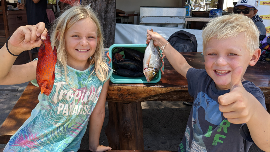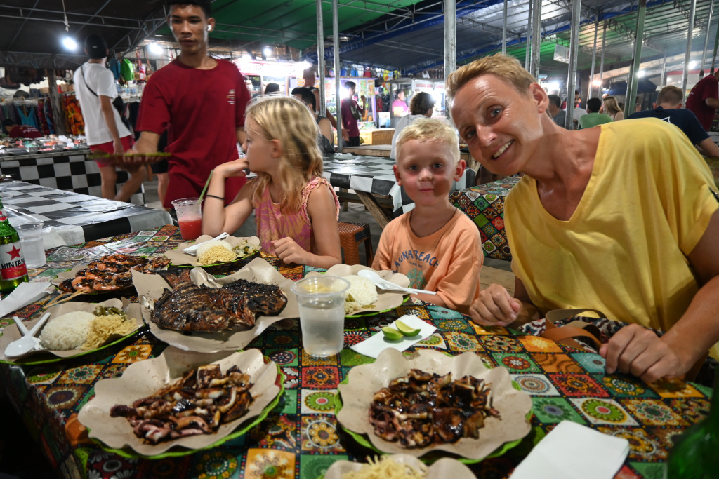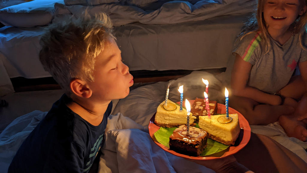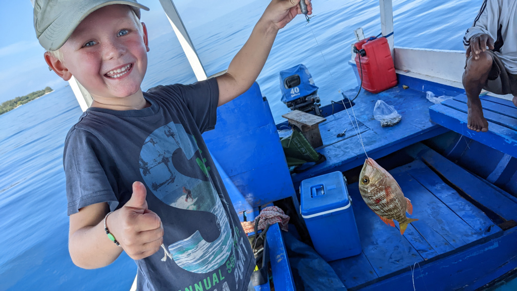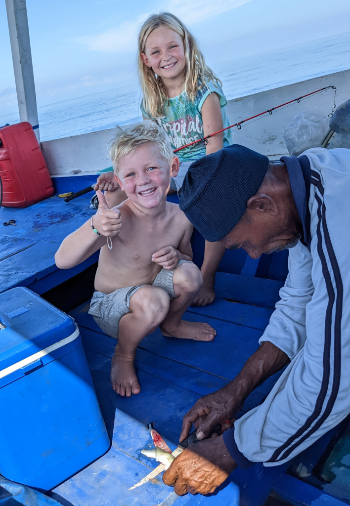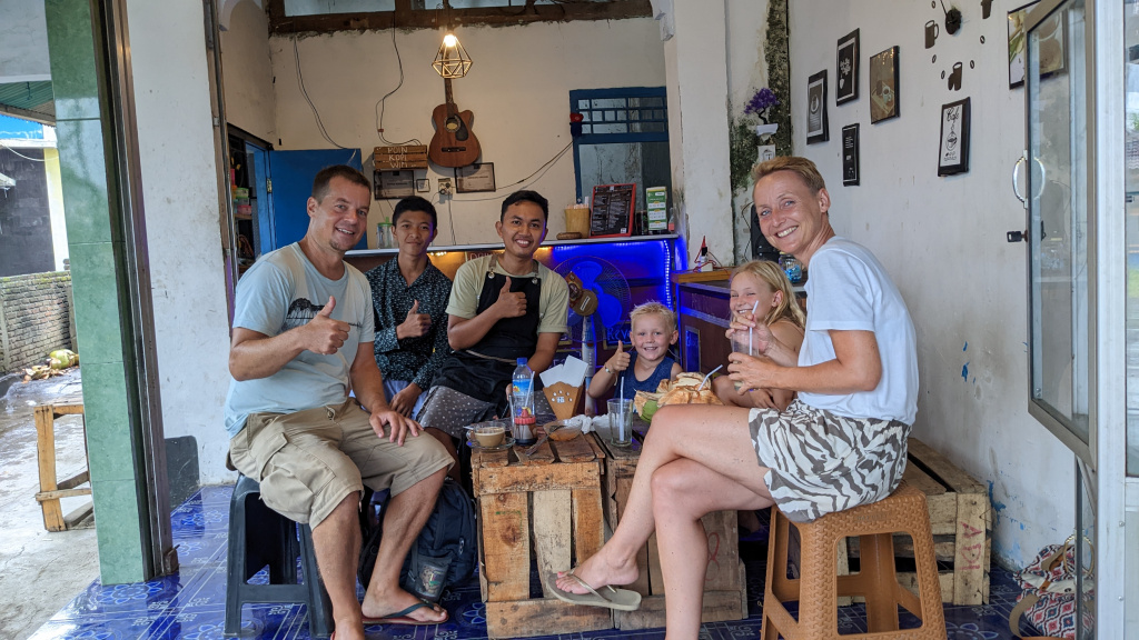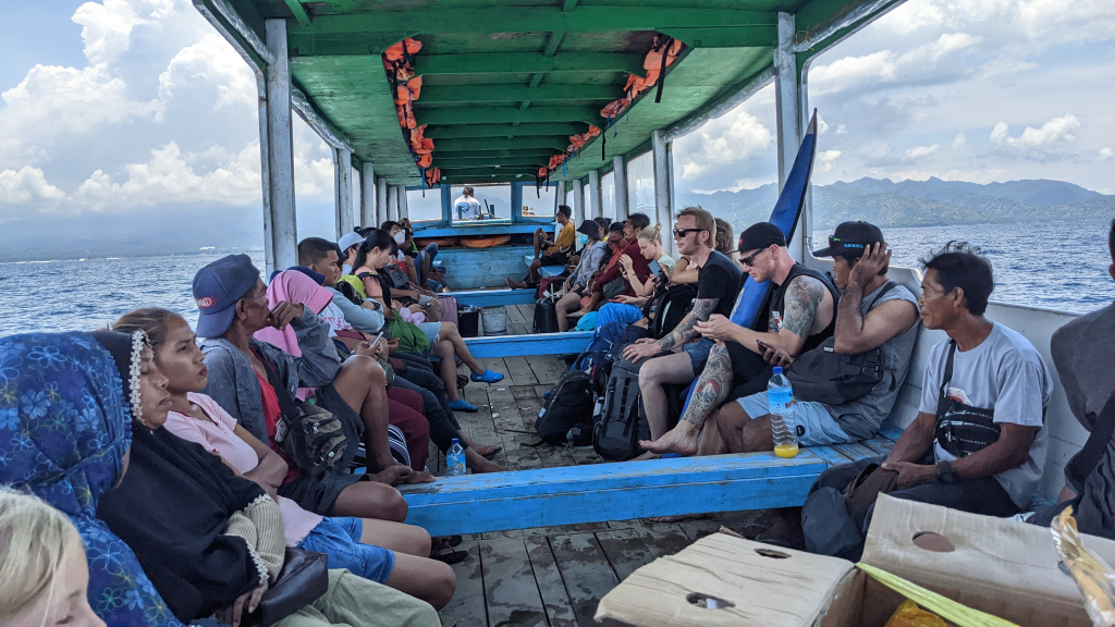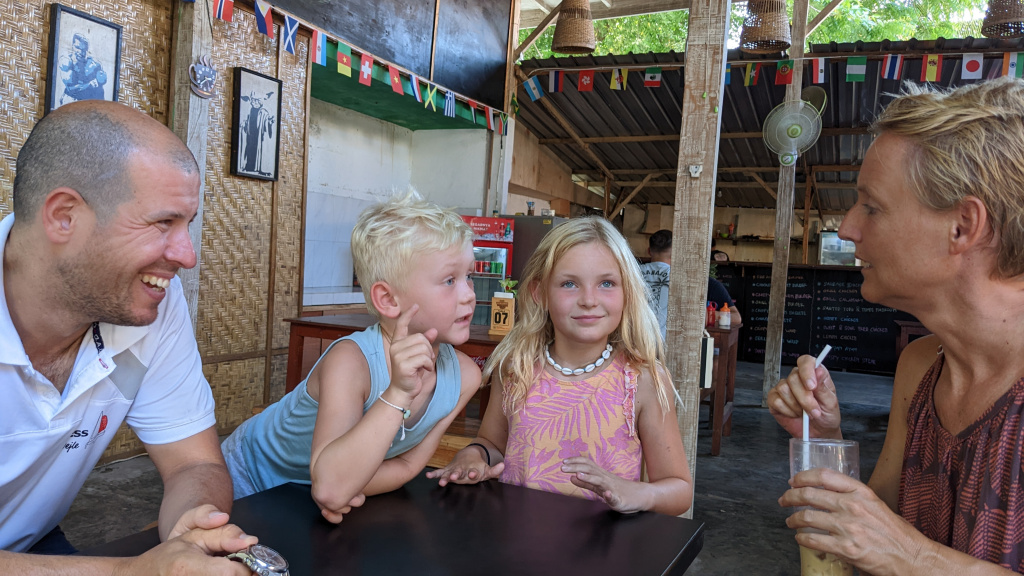 Nunung vom Surfcamp fährt uns früh morgens nach Padang Bai. Von dort startet das Boot zu den Gilis. Auch wenn wir nur eine gute Woche in der Surf WG waren, fällt uns der Abschied schwer.Die Überfahrt ist ziemlich wellig und nach einem kurzen Halt auf Lombok sind wir froh, endlich wieder unsere Füsse auf Sand zu setzen. Willkommen auf Gili Trawangan, von den Locals kurz Gili-T genannt. Verkehrstechnisch sind die Gilis das wohltuende Gegenteil von Bali. Hier gibt es keinen motorisierten Verkehr. Als Transportmittel stehen lediglich Fahrräder und Pferdekutschen zu Auswahl.Wir ziehen uns erstmal ins OG eines Cafes zurück. Die Kids malden während einer von uns auf Unterkunftsuche geht.Die Kutschfahrt zur Unterkunft. Hier muss wieder ordentlich gehandelt werden.Im Wah Resort beziehen wir einen wunderschönen Holz-Bungalow mit Pool vor der Nase. Wir fühlen uns so wohl, dass wir zehn Tage bleiben.Der Strand liegt gleich vor der Tür. Links im Bild Gili Meno und im Hintergrund Lombok.Das Wasser ist eine Wohltat nach Bali, wo das Meer mit zunehmendem Regen immer trüber wurde. Drei von uns haben sich dort eine Ohrinfektion geholt, welche wir hier auskurieren.Essenstechnisch steht Gili-T der großen Schwester Bali in nichts nach. Fancy Food gibt es hier an jeder Ecke, falls man keine Lust mehr auf Bakso, indonesische Nudelsuppe hat.Nasi Campur im gleichen Laden. Aus verschiedenen fertigen Gerichten stellt man sich seine ganz eigene Combo zusammen.Nachdem wir gut angekommen sind, begeben wir uns auf die Suche nach Meeresschildkröten, die es hier im flachen Wasser geben soll. Einer die vielen Jungs vom Wah Resort nimmt Delia mit aufs Wasser. In den nächsten Tagen erkunden wir die Unterwasserwelt vor der Insel.Die Schildkröten lassen nicht lange auf sich warten. Sie kommen bei Flut ganz nah an den Strand um das Seegras am Grund zu fressen. Schnorchler lassen sie völlig unbeeindruckt.So können wir diese fantastischen Tier in aller Ruhe studieren.Unter Wasser und über Wasser.Wir machen einen Ausflug nach Gili Meno. Auf dem Weg tauchen ab und zu Schildkröten auf.Die mittlere der drei Inseln ist deutlich weniger entwickelt und die meisten der wenigen Unterkünften scheinen nach Covid noch gar nicht wieder geöffnet zu sein.Nachdem wir den Babyschildkröten in einer privat geführten Aufzuchtstation zugesehen haben, wandern wir den Strand entlang. Dabei beobachten wir, wie Baumaterial mit Pferdekutschen über die Insel transportiert wird.Dabei geht es nicht zimperlich zu.Endlich kann Reto seinen Geburtstag mal im „Sommer“ feiern!Reto hat sich einen Angeltrip zum 6.Geburtstag gewünscht. Also starten wir früh am Morgen und werden zur Begrüßung mit einem Blick auf Lombok’s Vulkane belohnt.Das Wasser ist ruhig und wir sind weitestgehend allein bei der Suche nach Fischen.Das Angeln gestaltet sich hier etwas schwieriger als auf den Perhentians. Aber unsere Geduld wird schließlich belohnt.Als uns der Köder ausgeht filettiert unser Begleiter einen unserer gefangenen Fische.Und schon beißen sie wieder (Kannibalenfische;-)Nach vier Stunden kehren wir erschöpft und mit genug Fang für unser Abendessen zurück.Nebenbei spähen wir noch ein paar Schildkröten aus.Die Kinder freuen sich schon aufs Essen!Wir lassen uns die letzten Malaisen vom Surfen raus massieren.Lasse hat sich entschlossen uns für ein paar Tage zu folgen. Die Freude ist riesig und wir spielen kräftig MauMau. Am gleichen Tag laufen uns noch Nacho und Jil über den Weg:-)Wir machen einen Ausflug zur Westküste, um den Sonnenuntergang hinter Bali zu bewundern.Der Rückweg mit den klapprigen Fahrrädern führt über Sandwege in die Finsternis. Wir leuchten mit den Handys vorraus.Wir besuchen den Nachtmarkt.Zielsicher finden die Kids das exklusive Essen.Familienfoto dank Lasse.Es geht los: Garnelenspieße, Red Snapper und gegrillter Tintenfisch. Irgenwann holt uns unser Weiterflug nach Singapur ein und wir warten auf die Fähre nach Lombok……die wir uns mit ein paar anderen Fahrgästen teilen.Wir passieren Gili Meno und Gili Air, ehe wir in Bangsal anlegen.Die letzte Nacht verbringen wir in Praya auf Lombok. Völlig untouristisch. Man winkt uns von allen Seiten zu und die Kinder zeigen auf uns.Nach Maggi goreng, Coconut und Instant Kaffee machen wir neuen Freunde beim Schach Spielen. Wir hatten eine wunderbare Zeit in Indonesien und werden bestimmt auf eine der 13.000 Inseln wiederkehren. Da jetzt aber die Regenzeit und Stürme beginnen ziehen wir erstmal weiter nach Singapur und Ozeanien.