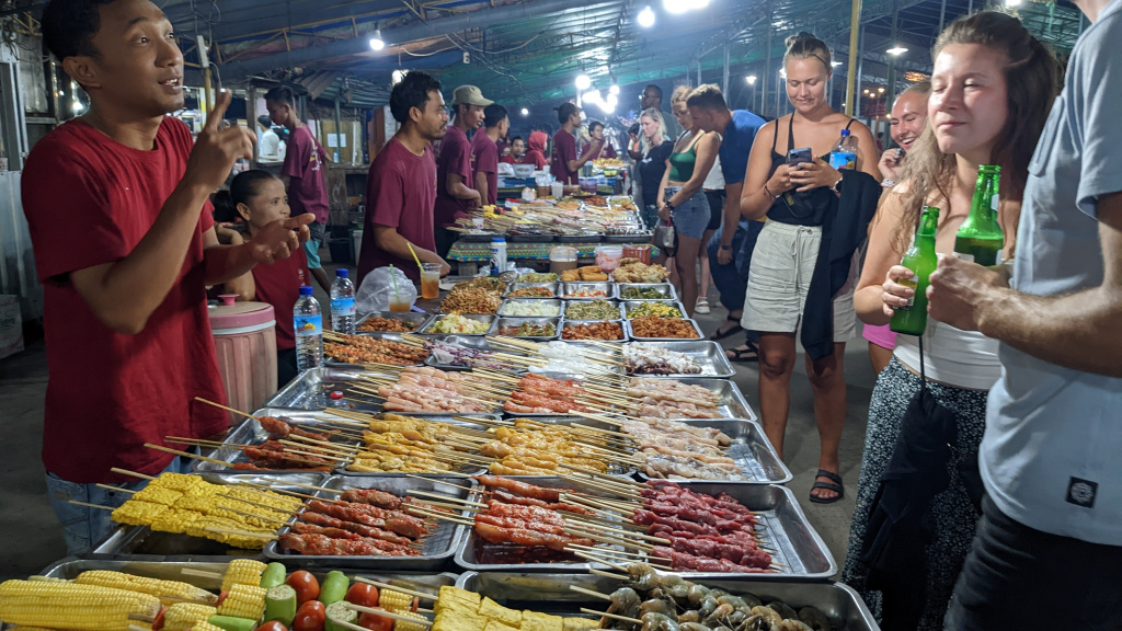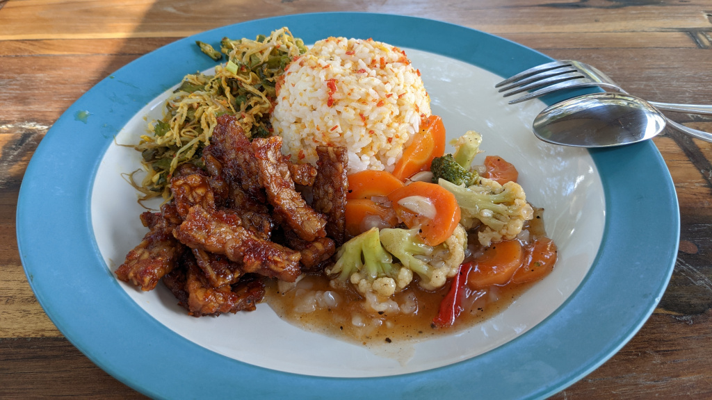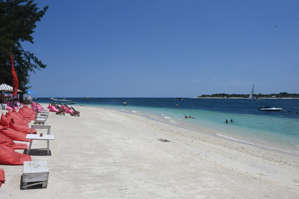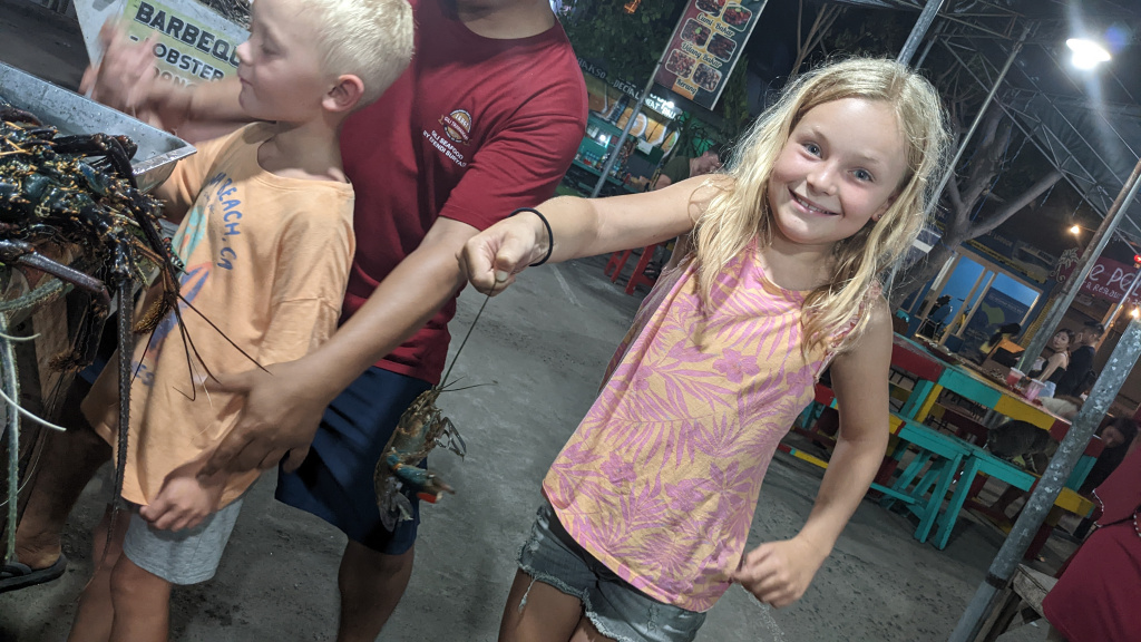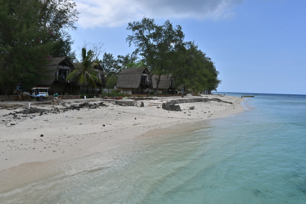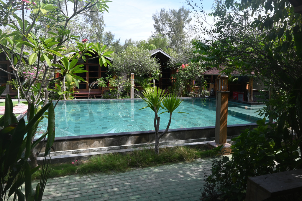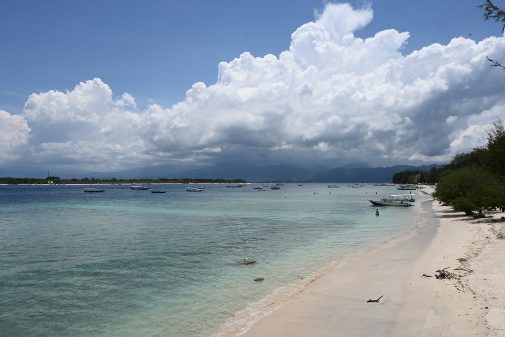 Nunung vom Surfcamp fährt uns früh morgens nach Padang Bai. Von dort startet das Boot zu den Gilis. Auch wenn wir nur eine gute Woche in der Surf WG waren, fällt uns der Abschied schwer.Die Überfahrt ist ziemlich wellig und nach einem kurzen Halt auf Lombok sind wir froh, endlich wieder unsere Füsse auf Sand zu setzen. Willkommen auf Gili Trawangan, von den Locals kurz Gili-T genannt. Verkehrstechnisch sind die Gilis das wohltuende Gegenteil von Bali. Hier gibt es keinen motorisierten Verkehr. Als Transportmittel stehen lediglich Fahrräder und Pferdekutschen zu Auswahl.Wir ziehen uns erstmal ins OG eines Cafes zurück. Die Kids malden während einer von uns auf Unterkunftsuche geht.Die Kutschfahrt zur Unterkunft. Hier muss wieder ordentlich gehandelt werden.Im Wah Resort beziehen wir einen wunderschönen Holz-Bungalow mit Pool vor der Nase. Wir fühlen uns so wohl, dass wir zehn Tage bleiben.Der Strand liegt gleich vor der Tür. Links im Bild Gili Meno und im Hintergrund Lombok.Das Wasser ist eine Wohltat nach Bali, wo das Meer mit zunehmendem Regen immer trüber wurde. Drei von uns haben sich dort eine Ohrinfektion geholt, welche wir hier auskurieren.Essenstechnisch steht Gili-T der großen Schwester Bali in nichts nach. Fancy Food gibt es hier an jeder Ecke, falls man keine Lust mehr auf Bakso, indonesische Nudelsuppe hat.Nasi Campur im gleichen Laden. Aus verschiedenen fertigen Gerichten stellt man sich seine ganz eigene Combo zusammen.Nachdem wir gut angekommen sind, begeben wir uns auf die Suche nach Meeresschildkröten, die es hier im flachen Wasser geben soll. Einer die vielen Jungs vom Wah Resort nimmt Delia mit aufs Wasser. In den nächsten Tagen erkunden wir die Unterwasserwelt vor der Insel.Die Schildkröten lassen nicht lange auf sich warten. Sie kommen bei Flut ganz nah an den Strand um das Seegras am Grund zu fressen. Schnorchler lassen sie völlig unbeeindruckt.So können wir diese fantastischen Tier in aller Ruhe studieren.Unter Wasser und über Wasser.Wir machen einen Ausflug nach Gili Meno. Auf dem Weg tauchen ab und zu Schildkröten auf.Die mittlere der drei Inseln ist deutlich weniger entwickelt und die meisten der wenigen Unterkünften scheinen nach Covid noch gar nicht wieder geöffnet zu sein.Nachdem wir den Babyschildkröten in einer privat geführten Aufzuchtstation zugesehen haben, wandern wir den Strand entlang. Dabei beobachten wir, wie Baumaterial mit Pferdekutschen über die Insel transportiert wird.Dabei geht es nicht zimperlich zu.Endlich kann Reto seinen Geburtstag mal im „Sommer“ feiern!Reto hat sich einen Angeltrip zum 6.Geburtstag gewünscht. Also starten wir früh am Morgen und werden zur Begrüßung mit einem Blick auf Lombok’s Vulkane belohnt.Das Wasser ist ruhig und wir sind weitestgehend allein bei der Suche nach Fischen.Das Angeln gestaltet sich hier etwas schwieriger als auf den Perhentians. Aber unsere Geduld wird schließlich belohnt.Als uns der Köder ausgeht filettiert unser Begleiter einen unserer gefangenen Fische.Und schon beißen sie wieder (Kannibalenfische;-)Nach vier Stunden kehren wir erschöpft und mit genug Fang für unser Abendessen zurück.Nebenbei spähen wir noch ein paar Schildkröten aus.Die Kinder freuen sich schon aufs Essen!Wir lassen uns die letzten Malaisen vom Surfen raus massieren.Lasse hat sich entschlossen uns für ein paar Tage zu folgen. Die Freude ist riesig und wir spielen kräftig MauMau. Am gleichen Tag laufen uns noch Nacho und Jil über den Weg:-)Wir machen einen Ausflug zur Westküste, um den Sonnenuntergang hinter Bali zu bewundern.Der Rückweg mit den klapprigen Fahrrädern führt über Sandwege in die Finsternis. Wir leuchten mit den Handys vorraus.Wir besuchen den Nachtmarkt.Zielsicher finden die Kids das exklusive Essen.Familienfoto dank Lasse.Es geht los: Garnelenspieße, Red Snapper und gegrillter Tintenfisch. Irgenwann holt uns unser Weiterflug nach Singapur ein und wir warten auf die Fähre nach Lombok……die wir uns mit ein paar anderen Fahrgästen teilen.Wir passieren Gili Meno und Gili Air, ehe wir in Bangsal anlegen.Die letzte Nacht verbringen wir in Praya auf Lombok. Völlig untouristisch. Man winkt uns von allen Seiten zu und die Kinder zeigen auf uns.Nach Maggi goreng, Coconut und Instant Kaffee machen wir neuen Freunde beim Schach Spielen. Wir hatten eine wunderbare Zeit in Indonesien und werden bestimmt auf eine der 13.000 Inseln wiederkehren. Da jetzt aber die Regenzeit und Stürme beginnen ziehen wir erstmal weiter nach Singapur und Ozeanien.