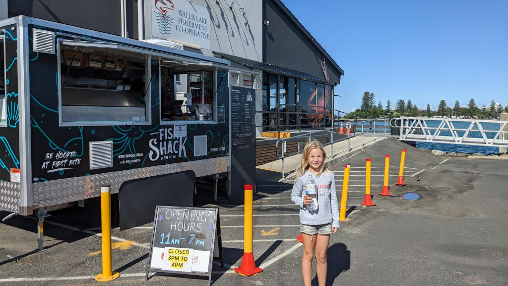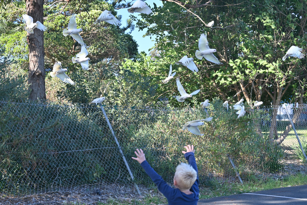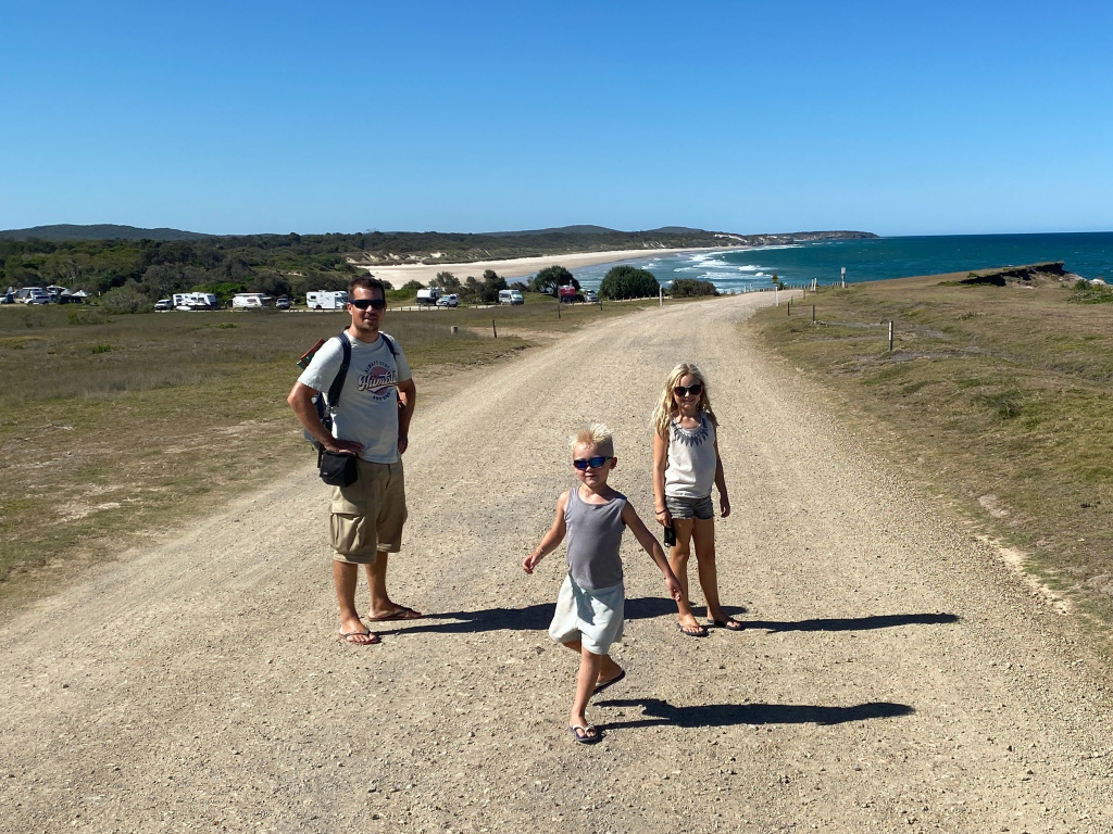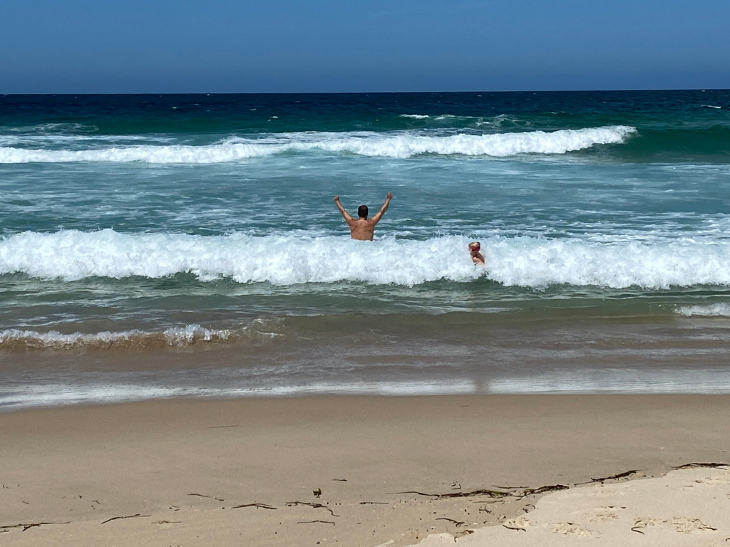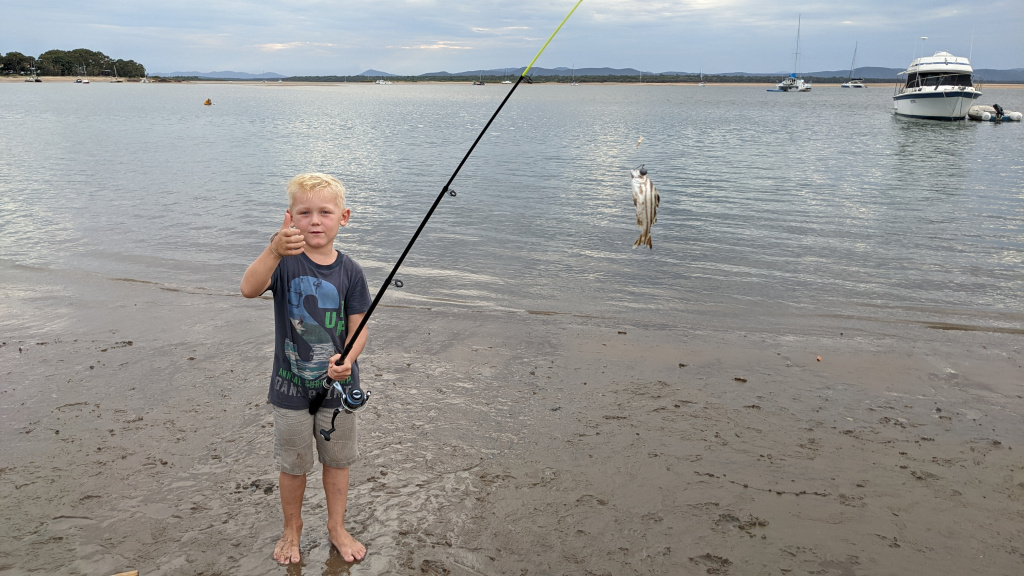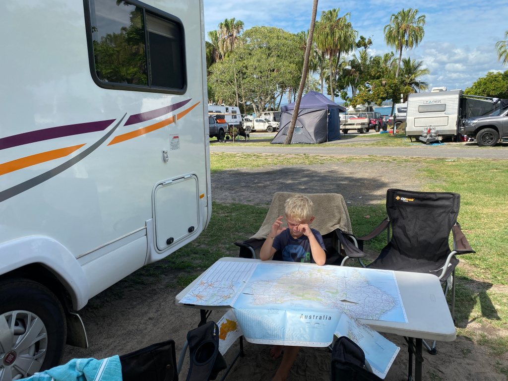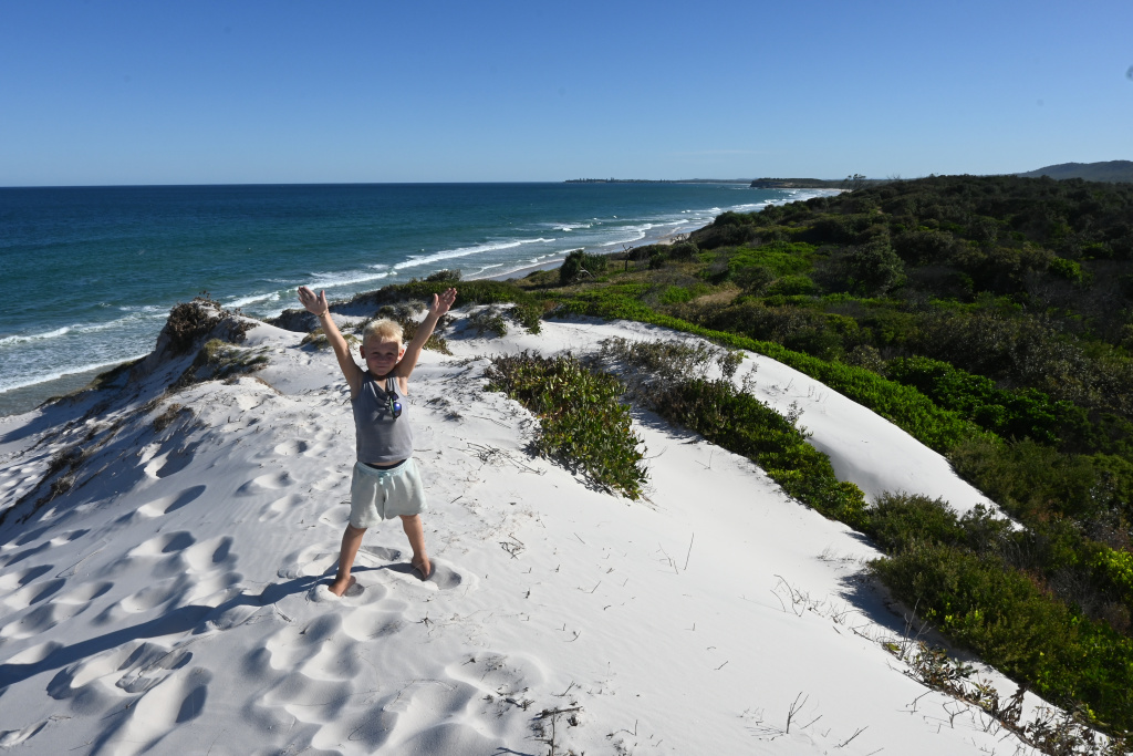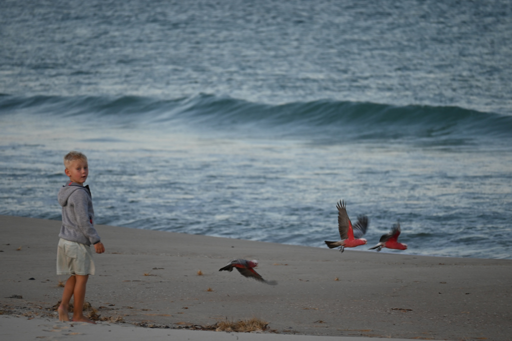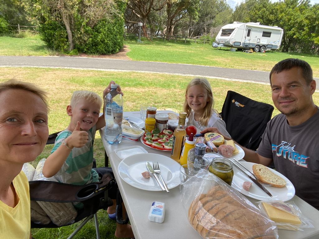 Nach 7h Flug kommen wir gegen 22:00 in Sydney an. Wir fahren mit einem Taxi durch die Dunkelheit nach Caringbah. Im Erdgeschoss unseres Hotels befindet sich ein Pub und eine Sportsbar. Hier gibt es Begrüßungsgetränke für Groß und Klein vor dem Weihnachtsbaum. Nach einer kurzen Nacht gehen wir zur nahegelegenen Autovermietung und holen unser kleines Wohnmobil ab. Den Rest des Tages verbingen wir mit Einkaufen von westlichen Delikatessen;-) Reto ist glücklich mit der Krakauer, die aussieht wie die Bierwurst von Oma und Opa. Senf verbrauchen wir in den nächsten Wochen in rohen Mengen;-)Um erstmal nicht weit zu fahren, machen wir unseren ersten Stop in Wollongong, wenig südlich von Sydney. Vom Campingplatz sind es nur ein paar Schritte bis zum Meer.Wir werden von einem fantastischen Strand und tiefblauem Meer begrüßt.Und wir haben alles für uns!!Wir machen einen ausgedehnten Strandspaziergang.Wir klettern über Felsen und finden versteinertes Holz.Auf dem Pier in der nächsten Bucht schreien die Kinder „Riesenrochen“!! Wir denken zunächst bei den dunklen Flecken im Wasser handele es sich um Felsen.Tatsächlich! Die beiden Exemplare sind sicherlich 2m lang!Kormorane und Pelikane warten geduldig, ob beim Anlanden der Fischerboote etwas für sie abfällt.In den umliegenden Bäumen beobachten wir zahlreiche schwarze Kakadus. Später erfahren wir, dass diese in Australien recht selten sind.Die weißen Kakadus wiederum, werden unsere ständigen Begleiter. Delia und Reto freuen sich schon lange aufs Campen und haben zahlreiche Ideen, wie sie helfen können. Hier fährt Reto den Tank unseres Chemieklos zur Dumping Station.Wir werden 4 Wochen in Australiien bleiben und wollen in dieser Zeit die Ostküste bis zu den Whitsunday Islands hochfahren, um dann das Auto wieder nach Sydney zurück zu bringen. In Wollongong beginnt unsere Reise mit dem Pacific Drive.Nachdem wir uns durch den Großraum Sydney gearbeitet haben, stoppen wir nicht weit nördlich in The Entrance. Wir bemerken schnell, dass die Campingplätze besonders an den Wochenenden schnell ausgebucht sind. Es ist Hochsaison und nach Corona sind anscheinend noch mehr Camper als gewöhnlich unterwegs.Trotzdem haben wir auch hier den Strand fast für uns allein.Typisches australisches Sttraßenbild in Tuncurry. Platz ist hier keine Mangelware. Dafür hapert es an Fußwegen.Am Hafen beobachten wir die riesigen Pelikane.Wir laufen an der Mündung des Coolongolook Rivers entlang.Selbst der Fluß ist hier türkisfarben. Das könnte allerdings auch mit dem UV-Index von 13 zusammenhängen.Wir beobachten die Vögel und sehen ein paar Seeadlern zu, wie sie Fische fangen und gegen die Möwen verteidigen.Von hinten beobachten uns jede Menge Papageien.Aber nur bis Reto sie entdeckt.Wir haben die australischen Fish Shacks lieb gewonnen, auch wenn wir eigentlich keine Freunde der Friteuse sind. Aber frisch gefangenen, leicht fritierten Fisch mit Chips (Pommes) und Tartar-Sauce können die Australier einfach besonders gut.Was sie noch sehr gut können sind Spielplätze. Meistens in Symbiose mit öffentlichen Grillstellen.Mit vollem Bauch wandern wir am Strand zurück zu unserem Stellplatz am Sporty (Sportclub Tuncurry).Unendliche Weite. Wir sehen ab und zu etwas im Wasser aufblinken.Und dann sehen wir wirklich vom Strand aus eine ganze Delfinschule! Wir sind völlig geflasht!Reto sammelt sich als erster und jagt munter weiter Papageien.Den nächsten Tag verbingen wir mit Baden……und Chillen am Strand.Wir fahren ca. alle drei Tage 4-5h um dann zwei bis drei volle Tage an einem Stop zu haben. Hier sind wir im Yuraygir Nationalpark. Es gibt eine Feuerstelle, ein Bioklo und jede Menge Natur auf einer Klippe über dem Meer. Auf dem Weg zum Strand steht plötzlich das erste Känguru vor uns!Aus dem Beutel schaut das zweite heraus.Die folgende Lichtung gibt dann die ganze Großfamilie Preis!Beim Sundowner schauen wir den drei Surfern auf ihren Longboards zu.Hier wachsen Sandblumen!Und jede Menge Steine warten darauf……ins Meer geflitscht zu werden.Delia schnappt sich die Kamera.Sie hat entdeckt, dass die Kängurus bis an den Strand kommen.Auf dem Rückweg sammeln wir Feuerholz.Delia und Reto schmelzen Marshmellows;-)Am nächsten Tag brechen wir zu einer Strandwanderung auf.Immer auf der Suche nach Deflinen und Walen. Auch wenn die Walsaison leider gerade vorbei ist. Man kann ja nie wissen…Dafür finden wir eine riesige weiße Düne.Wie üblich werden wir beobachtet. Diesmal von einem Adler.Und die Kängurus begleiten uns. Sie scheinen uns genauso interessant zu finden wie wir sie.Die Sonne geht so langsam unter und taucht die Landschaft in goldenes Licht.Sundowner über dem Meer.Wir ziehen weiter nach Tin Can Bay. Wir haben gelesen, dass man dort bei der Fütterung von wilden Delfinen zusehen kann. Seit mehr als dreißig Jahren bekommen sie dort ca. ein Fünftel ihres täglichen Fischbedarfs als Frühstück. Wir haben Glück und heute kommt die ganze Großfamilie einschließlich Baby-Delfin Luna.Delia und Reto dürfen auch Fische verfüttern. Ganz vorsichtig nehmen die Delfine die Fische aus der Hand. Berühren darf man die Tiere nicht.Wir erkunden die Mangroven um die Flußmündung.Ein „lachender Hans“ oder Jägerliest , der größte Kingfisher Australiens.Der Motorway ist hinter Brisbane nur noch zweispurig. Das große Auto, Wind und die Straßen lassen uns weit weniger schnell voran kommen als geplant.Nach Sichtung der Aktenlage durch Reto, beschliessen wir, unseren Stop in „1770“ zu unserem Umkehrpunkt zu machen. Wir wollen uns die ca.1500km bis zu den Whitsundays und zurück sparen in der Annahme, dass wir noch genug Traumstrände in Asien sehen werden. Wie im Hintergrund zu sehen, sind die meisten Australier mit Pickups und riesigen Wohnwagen unterwegs.Endlich ist es soweit. Gemäß des liebsten Hobbys der Australier kaufen wir uns auch eine Angel.Und haben schneller Erfolg als wir dachten!Während wir den Sonnenuntergang genieß