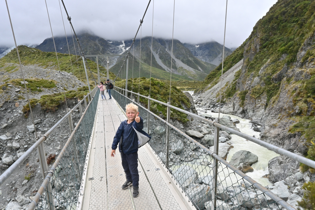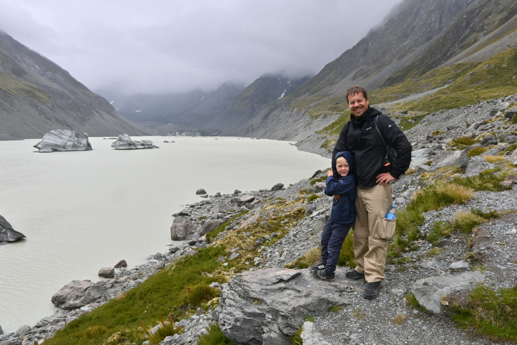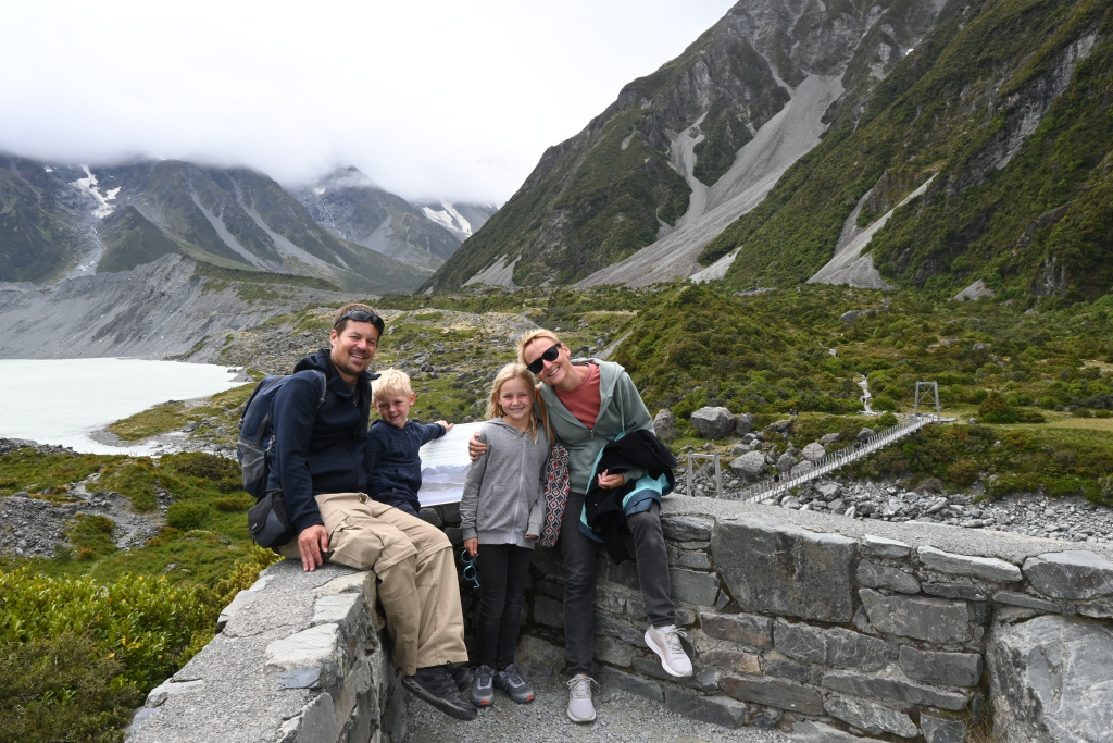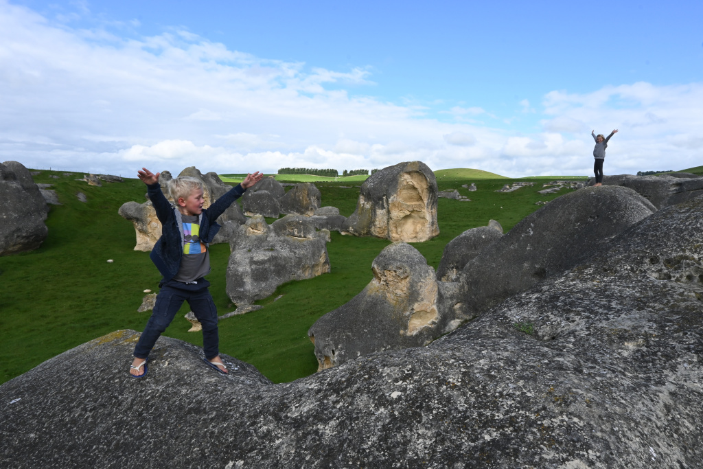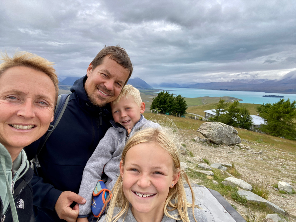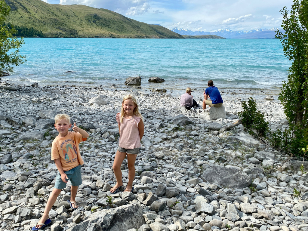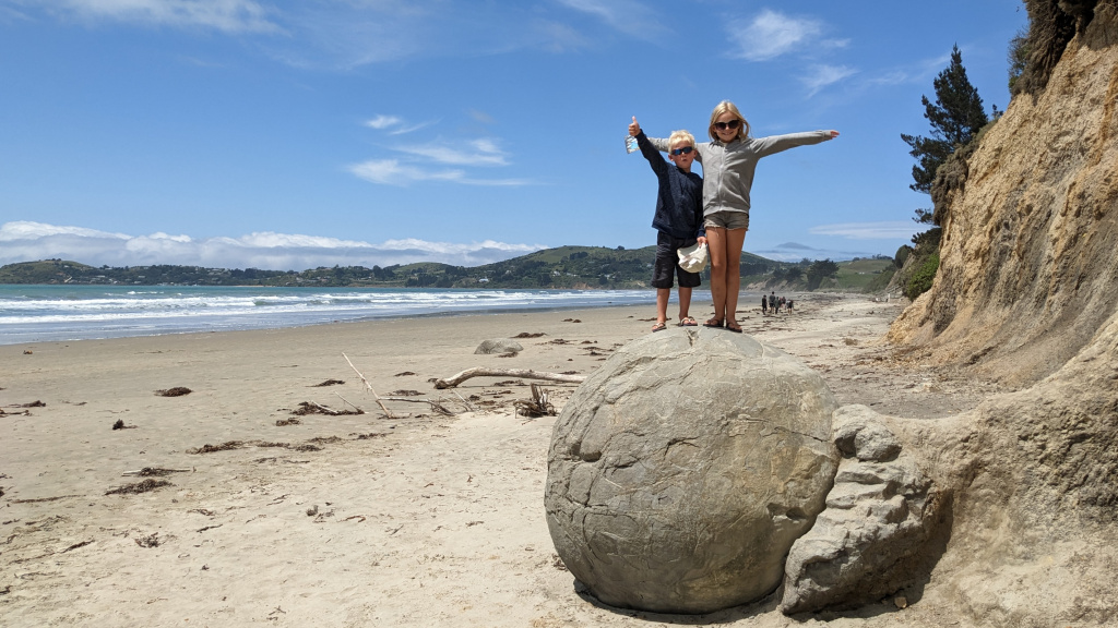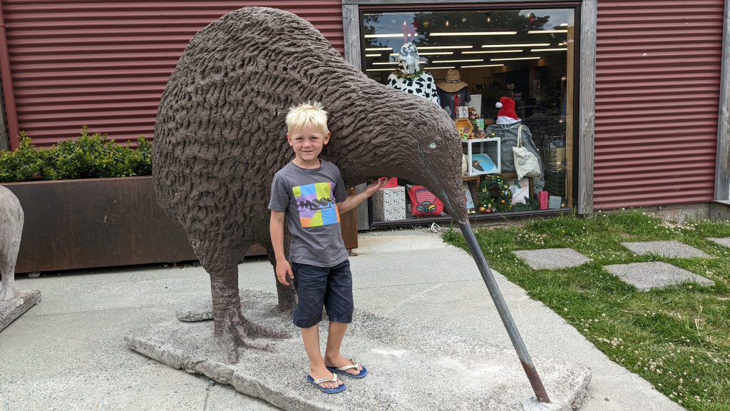 Mit einem Tag Verspätung fliegen wir in 3h von Sydney nach Auckland und kommen dort bei Dunkelheit und strömenden Regen an. Morgen fliegen wir weiter nach Christchurch um unseren Camper aufzusammeln. Die Stadtbesichtigung Auckland müssen wir auf das Ende unseres Neusseland-Aufenthalts verschieben. Am Flughafen in Christchurch gibt es Weihnachtsbaum-Donuts. Es ist ja auch schon der 15.Dezember!Auf dem Campingplatz in Christchurch nehmen wir uns einen Tag Zeit, um das Auto einzurichten und einzukaufen. Der Van hat knapp 400.000km auf der Uhr, schnurrt aber wie ein Kätzchen. Hoffentlich bleibt das so:-)Dann geht es los in Richtung Inselinneres. Wir sehen zum ersten Mal Schnee auf dieser Reise!Nicht lange und wir finden uns in eiinem Meer von Lupinien wieder.Fotostop!Es ist deutlich kälter hier als in Australien und das Wetter ist wechselhaft.Wir erreichen den Tekapo-See.Wir sind begeistert vom türkisenen Wasser vor schneebedeckten Bergen.Wir entschließen uns spontan zu bleiben. Anders als in Australien teilen wir uns den Campingplatz fast ausschließlich mit Touristen verschiedenster Nationen.Der morgentliche Blick auf den See. Obwohl unser Camper deutlich kleiner ist als das Wohnmobil in Australien, fühlen wir uns fast wohler. Delia und Reto haben es sich oben gemütlich gemacht.Vom Campingplatz brechen wir auf, um den Mount John zu besteigen. Oben befindet ein Observatorium und ein kleines Café, in dem wir leckeren Kuchen essen.Wir geniessen die Aussicht über den Tekapo-See.Der Rückweg führt uns hinunter zum See und am Ufer zurück.Wir erreichen gerade noch trocken den Camper, bevor es anfängt zu regnen.Reto und der Riesen-Kiwi. Wir sind schon gespannt, ob wir einen in natura sehen.Wir fahren weiter zum Pukaki-See und nutzen die Gelegenheit, am Ufer frisches Lachs-Sashimi zu kaufen und zu frühstücken.Alle lieben es!Wir fahren entlang des Pukaki-Sees tiefer in die Berge und campieren am Fuß des Mount Cook.Mit unserem Nachbarn Georg brechen wir unmittelbar zum Hooker Valley Track auf. Georg ist Hubschrauberpilot und passionierter Neuseeland-Liebhaber.Leider drücken die Wolken ins Tal, sodass die Gletscher nur ab und an durchschimmern.Reto auf der zweiten der drei Hängebrücken.Wir beobachten die Eisberge im Hooker-Lake, welche sich von der Gletscherzunge im Hintergrund abgespalten haben.Georg ist technisch bestens ausgerüstet und hat uns ein kleines Filmchen zusammen gestellt. Vielen Dank nochmals!Außerdem hat er jede Menge Insider-Tips parat.Am nächsten Morgen geben die Wolken den Gipfel des Mount Cook frei.Die ordentlich kalte Nacht haben wir mit Wärmflaschen und Heizlüfter überstanden. Die nächsten Tage sollen regnerisch werden. Also verabschieden wir uns schweren Herzens.Reto späht in Helm’s Klamm nach Orks. Hier wurde ein Teil von Herr der Ringe gefilmt.Auf der Weiterfahrt halten wir an einer der Lachsfarmen, die sich an den Abläufen der großen Bergseen befinden. Delia darf ihr Glück versuchen.Mit Ehrgeiz und Ausdauer fängt sich schließlich auch ein ordentlicher Lachs. Die eine Hälfte verzehren wir als Sashimi. Die andere Hälfte hauen wir in die Pfanne. Frischer geht’s nicht!Auf dem Weg zur Küste erkunden wir die Elephant-Rocks.Elefanten können wir zwar nicht erkennen……aber diese tollen Steinformationen eignen sich vortrefflich zum Klettern und Fotografieren.Am späten Nachmittag erreichen wir Oamaru an der Ostküste. Nebenan liegt gleich ein toller Spielplatz.Hier geht es beschaulich zu. Nachdem wir ohne Angellizenz nicht in den Seen fischen durften, nutzen wir die Gelegenheit, die Angel ins türkisfarbene Meer auszuwerfen.An der Steilküste liegt eine Kolonie von Blauaugen-Pinguinen. Früh morgens gehen sie auf Fischfang, um in der Abenddämmerung zurückzukehren. Fürs Zusehen verlangt man schlappe 70$ pro Person.Die Seelöwen können wir aber umsonst betrachten.Die Besitzerin des Casmpingplatzes verrät uns die zweite Pinguinkolonie nebenan, welche frei zugänglich ist. Zum Sonnenuntergang legen wir uns auf die Lauer. Unsere Geduld wird belohnt und wir sehen zu, wie sich die Zwergpinguine von den Wellen an den Strand spülen lassen, um zu ihren Nestern zu watscheln.Auf dem Weg nach Süden halten wir in einer der schönen Buchten.Die Erosion der Steilküste legt nach und nach immer mehr kugelförmige Sedimentgesteine frei: Die Moeraki-Boulders.Sie bestehen aus Calcit-gebundenem Lehm und Ton. Nachdem sie von den Wellen freigelegt werden, zerbrechen und versinken sie langsam im Sand. Wir wandern zwischen den Steinkugeln umher und nutzen den leeren Strand um eine Weihnachtsbotschaft in die Welt zu senden.Die Weihnachtstage verbringen wir am weißen Sandstrand von Dunedin. Es ist frisch, aber die Sonne scheint, sodass wir uns trotzdem ins Meer wagen.Wir beobachten Seelöwen und jagen Möwen.An Heiligabend entscheiden wir uns gegen kochen und burgern stattdessen am Strand!Die restlichen Pommes werden an die Möwen verfüttert.Bescherung im Bus!Von Dunedin erkunden wir den wilden Südzipfel der Südinsel Neuseelands. Zwischenstop am Kaka Point.Frühstücksstop am Meer.Achtung Seelöwen!Dahinten ist schon einer! Sie sind riesig und man rät uns immer mindestens 10m Abstand zu halten. Wanderung zum Nugget Point!Wir staunen über die Nuggets und beabachten kämpfende Seelöwen.Wir übernachten auf einem kleinen Freecamper bei Niagara, unweit von der Curio Bay. Wir angeln im von grünen Hügeln umgebenen Fjord.Wir halten am McCracken’s Rest und halten Ausschau nach Delfinen, bevor wir das Meer verlassen und nach Norden Richtung Te Anau fahren.Ausblick auf Stewart Island, Rückzugsort der letzten Kakapos.