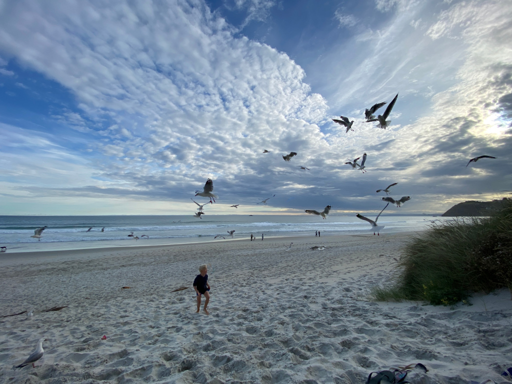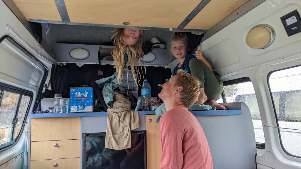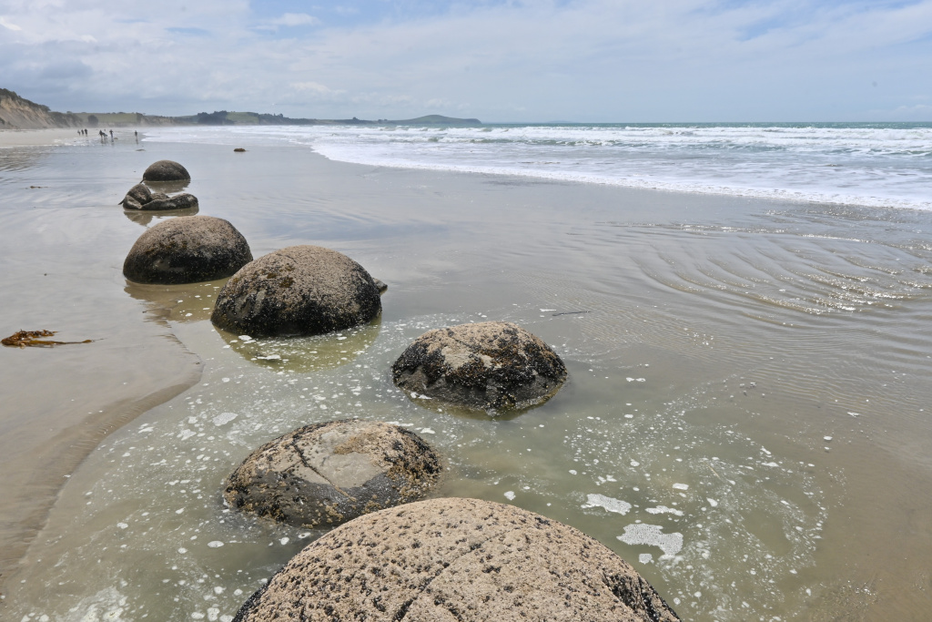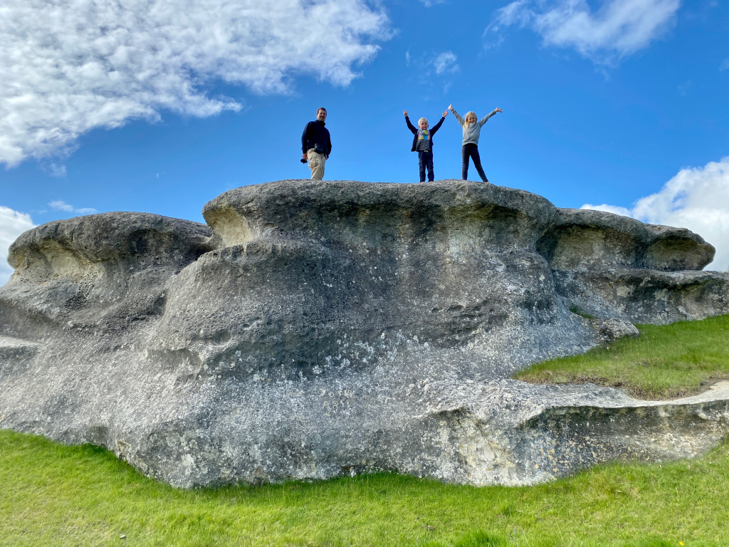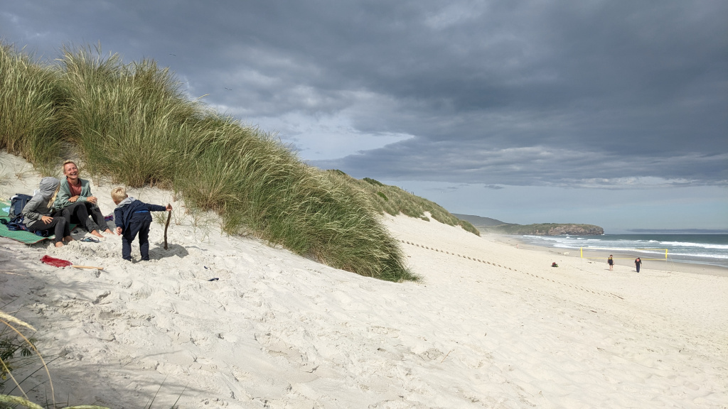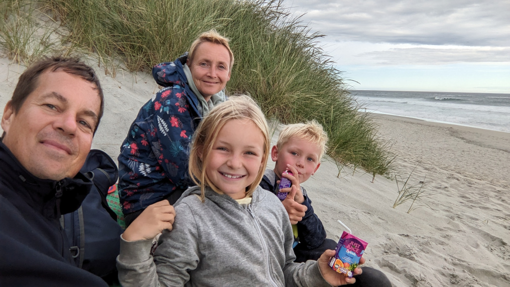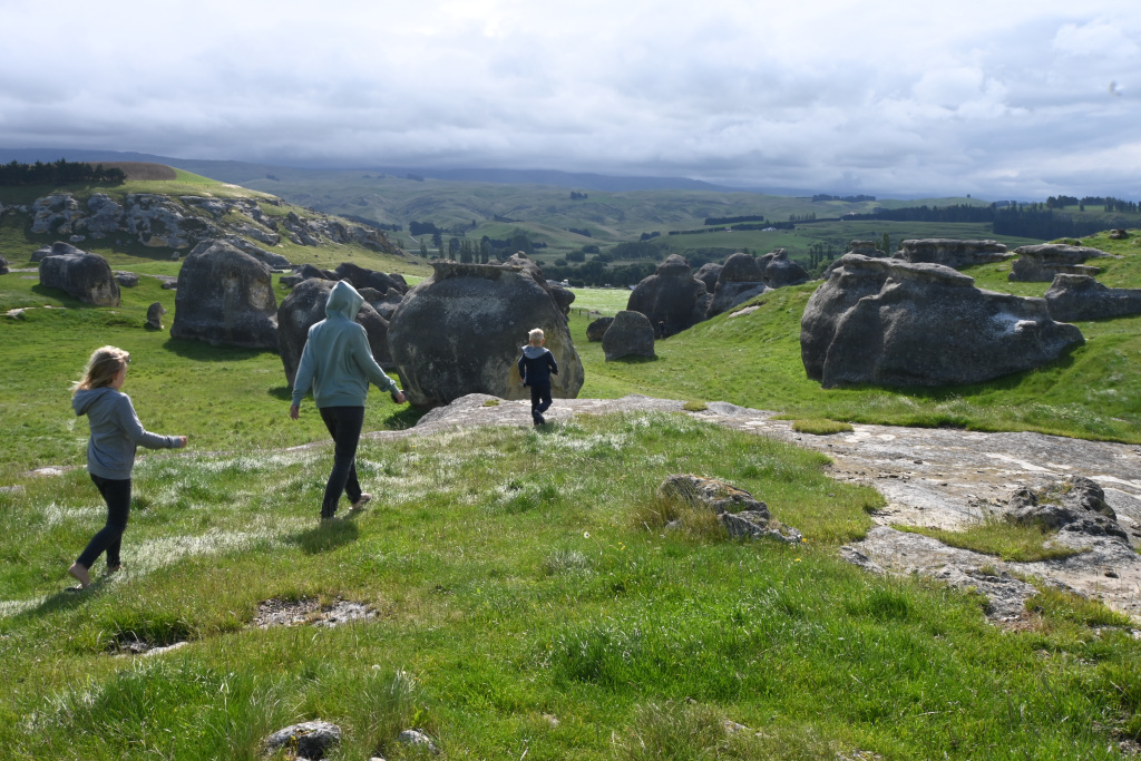 Mit einem Tag Verspätung fliegen wir in 3h von Sydney nach Auckland und kommen dort bei Dunkelheit und strömenden Regen an. Morgen fliegen wir weiter nach Christchurch um unseren Camper aufzusammeln. Die Stadtbesichtigung Auckland müssen wir auf das Ende unseres Neusseland-Aufenthalts verschieben. Am Flughafen in Christchurch gibt es Weihnachtsbaum-Donuts. Es ist ja auch schon der 15.Dezember!Auf dem Campingplatz in Christchurch nehmen wir uns einen Tag Zeit, um das Auto einzurichten und einzukaufen. Der Van hat knapp 400.000km auf der Uhr, schnurrt aber wie ein Kätzchen. Hoffentlich bleibt das so:-)Dann geht es los in Richtung Inselinneres. Wir sehen zum ersten Mal Schnee auf dieser Reise!Nicht lange und wir finden uns in eiinem Meer von Lupinien wieder.Fotostop!Es ist deutlich kälter hier als in Australien und das Wetter ist wechselhaft.Wir erreichen den Tekapo-See.Wir sind begeistert vom türkisenen Wasser vor schneebedeckten Bergen.Wir entschließen uns spontan zu bleiben. Anders als in Australien teilen wir uns den Campingplatz fast ausschließlich mit Touristen verschiedenster Nationen.Der morgentliche Blick auf den See. Obwohl unser Camper deutlich kleiner ist als das Wohnmobil in Australien, fühlen wir uns fast wohler. Delia und Reto haben es sich oben gemütlich gemacht.Vom Campingplatz brechen wir auf, um den Mount John zu besteigen. Oben befindet ein Observatorium und ein kleines Café, in dem wir leckeren Kuchen essen.Wir geniessen die Aussicht über den Tekapo-See.Der Rückweg führt uns hinunter zum See und am Ufer zurück.Wir erreichen gerade noch trocken den Camper, bevor es anfängt zu regnen.Reto und der Riesen-Kiwi. Wir sind schon gespannt, ob wir einen in natura sehen.Wir fahren weiter zum Pukaki-See und nutzen die Gelegenheit, am Ufer frisches Lachs-Sashimi zu kaufen und zu frühstücken.Alle lieben es!Wir fahren entlang des Pukaki-Sees tiefer in die Berge und campieren am Fuß des Mount Cook.Mit unserem Nachbarn Georg brechen wir unmittelbar zum Hooker Valley Track auf. Georg ist Hubschrauberpilot und passionierter Neuseeland-Liebhaber.Leider drücken die Wolken ins Tal, sodass die Gletscher nur ab und an durchschimmern.Reto auf der zweiten der drei Hängebrücken.Wir beobachten die Eisberge im Hooker-Lake, welche sich von der Gletscherzunge im Hintergrund abgespalten haben.Georg ist technisch bestens ausgerüstet und hat uns ein kleines Filmchen zusammen gestellt. Vielen Dank nochmals!Außerdem hat er jede Menge Insider-Tips parat.Am nächsten Morgen geben die Wolken den Gipfel des Mount Cook frei.Die ordentlich kalte Nacht haben wir mit Wärmflaschen und Heizlüfter überstanden. Die nächsten Tage sollen regnerisch werden. Also verabschieden wir uns schweren Herzens.Reto späht in Helm’s Klamm nach Orks. Hier wurde ein Teil von Herr der Ringe gefilmt.Auf der Weiterfahrt halten wir an einer der Lachsfarmen, die sich an den Abläufen der großen Bergseen befinden. Delia darf ihr Glück versuchen.Mit Ehrgeiz und Ausdauer fängt sich schließlich auch ein ordentlicher Lachs. Die eine Hälfte verzehren wir als Sashimi. Die andere Hälfte hauen wir in die Pfanne. Frischer geht’s nicht!Auf dem Weg zur Küste erkunden wir die Elephant-Rocks.Elefanten können wir zwar nicht erkennen……aber diese tollen Steinformationen eignen sich vortrefflich zum Klettern und Fotografieren.Am späten Nachmittag erreichen wir Oamaru an der Ostküste. Nebenan liegt gleich ein toller Spielplatz.Hier geht es beschaulich zu. Nachdem wir ohne Angellizenz nicht in den Seen fischen durften, nutzen wir die Gelegenheit, die Angel ins türkisfarbene Meer auszuwerfen.An der Steilküste liegt eine Kolonie von Blauaugen-Pinguinen. Früh morgens gehen sie auf Fischfang, um in der Abenddämmerung zurückzukehren. Fürs Zusehen verlangt man schlappe 70$ pro Person.Die Seelöwen können wir aber umsonst betrachten.Die Besitzerin des Casmpingplatzes verrät uns die zweite Pinguinkolonie nebenan, welche frei zugänglich ist. Zum Sonnenuntergang legen wir uns auf die Lauer. Unsere Geduld wird belohnt und wir sehen zu, wie sich die Zwergpinguine von den Wellen an den Strand spülen lassen, um zu ihren Nestern zu watscheln.Auf dem Weg nach Süden halten wir in einer der schönen Buchten.Die Erosion der Steilküste legt nach und nach immer mehr kugelförmige Sedimentgesteine frei: Die Moeraki-Boulders.Sie bestehen aus Calcit-gebundenem Lehm und Ton. Nachdem sie von den Wellen freigelegt werden, zerbrechen und versinken sie langsam im Sand. Wir wandern zwischen den Steinkugeln umher und nutzen den leeren Strand um eine Weihnachtsbotschaft in die Welt zu senden.Die Weihnachtstage verbringen wir am weißen Sandstrand von Dunedin. Es ist frisch, aber die Sonne scheint, sodass wir uns trotzdem ins Meer wagen.Wir beobachten Seelöwen und jagen Möwen.An Heiligabend entscheiden wir uns gegen kochen und burgern stattdessen am Strand!Die restlichen Pommes werden an die Möwen verfüttert.Bescherung im Bus!Von Dunedin erkunden wir den wilden Südzipfel der Südinsel Neuseelands. Zwischenstop am Kaka Point.Frühstücksstop am Meer.Achtung Seelöwen!Dahinten ist schon einer! Sie sind riesig und man rät uns immer mindestens 10m Abstand zu halten. Wanderung zum Nugget Point!Wir staunen über die Nuggets und beabachten kämpfende Seelöwen.Wir übernachten auf einem kleinen Freecamper bei Niagara, unweit von der Curio Bay. Wir angeln im von grünen Hügeln umgebenen Fjord.Wir halten am McCracken’s Rest und halten Ausschau nach Delfinen, bevor wir das Meer verlassen und nach Norden Richtung Te Anau fahren.Ausblick auf Stewart Island, Rückzugsort der letzten Kakapos.